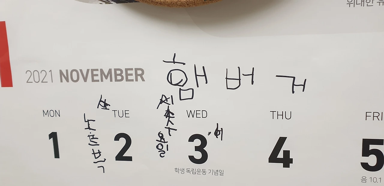 달력을 보니 뭐가 적혀있다. 보고 진짜 빵 터졌다. 바로 사진 찍고 아내에게 보내줬다. "ㅋㅋㅋㅋㅋㅋㅋㅋㅋ"와 함께.