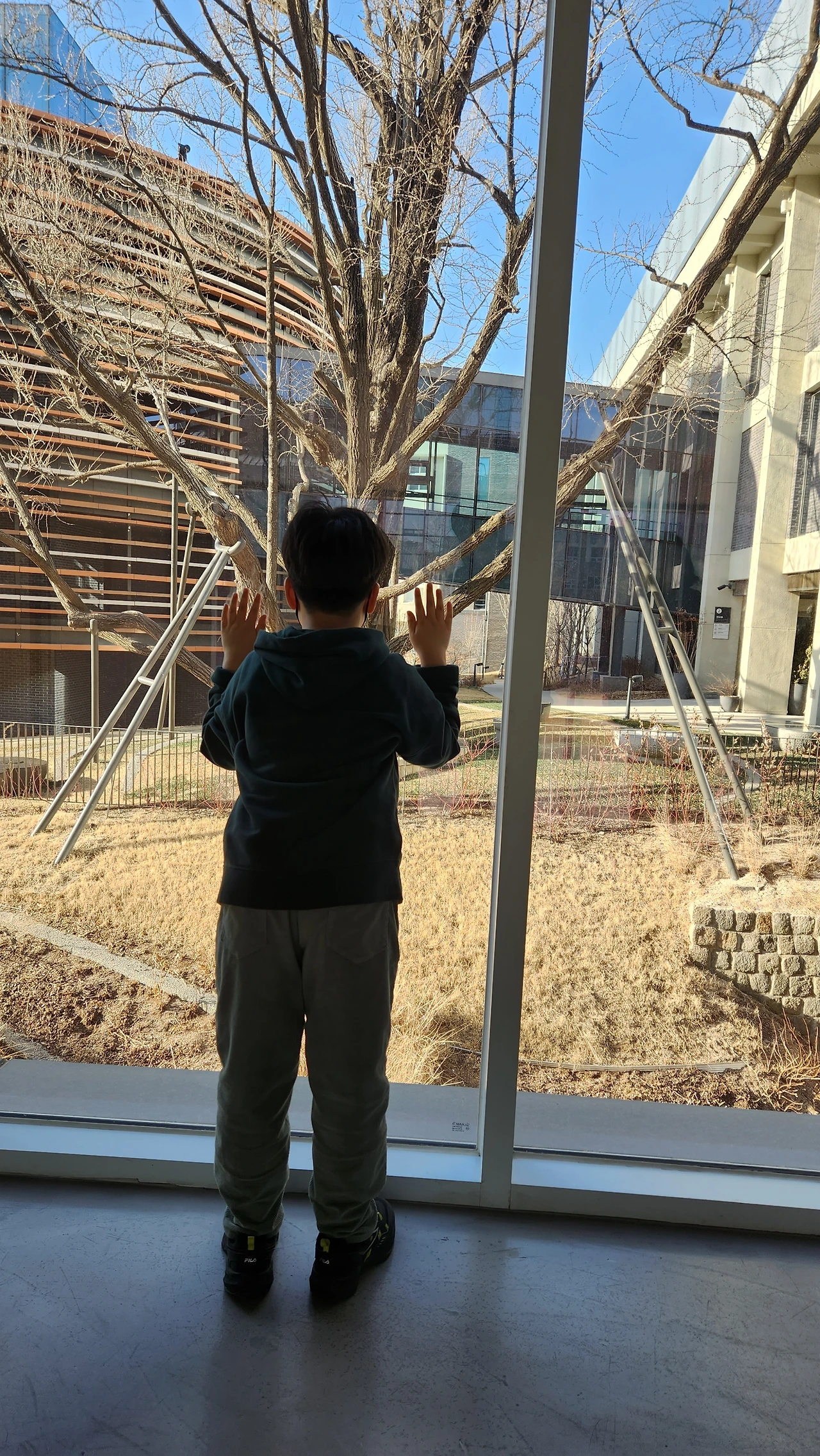 층과 층 사이에서 보이는 오래된 나무는 시간의 깊이를 느끼게 한다. 원래 이곳은 여고였다고 한다.