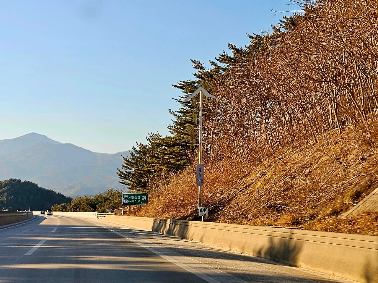 마음을 가다듬고 고속도로를 달리는데 그제야 하늘이 눈에 들어왔다. 미세먼지 없이 푸른 하늘이 높다. 때마침 손양 졸음쉼터를 지났다. 조금만 더 가면 내가 좋아하는 풍경이 나올 것이다. 굳어 있던 마음이 조금씩 풀리기 시작했다. 삼분쯤 더 달리니 오른쪽에 '대청봉'이라고 쓰인 익숙한 표지판이 보였다. 길을 바라보던 시선을 살짝 위로 들어 장면을 바라보았다. 저 멀리 높은 산이 보인다. 일직선의 고속도로 위, 전깃줄 하나 없이 탁 트인 하늘과 멀리 보이는 높고 커다란 산봉우리가 시원하다. 산등성이 제일 왼쪽에 가장 높은 봉우리가 대한민국에서 세 번째로 높은 설악산 대청봉이다. 설악산 근처에서는 봉우리가 보이지 않는다. 하지만 설악산과 접해있는 속초, 고성, 양양을 통틀어 산에 올라가지 않아도 봉우리를 볼 수 있는 곳이 딱 두 군데 있다. 그중 하나가 바로 동해고속도로 속초 방면의 이곳이다.