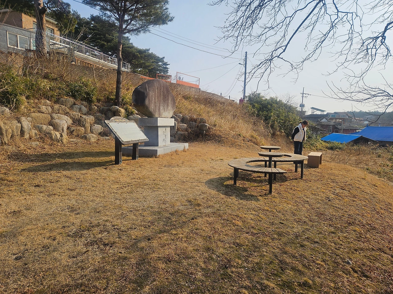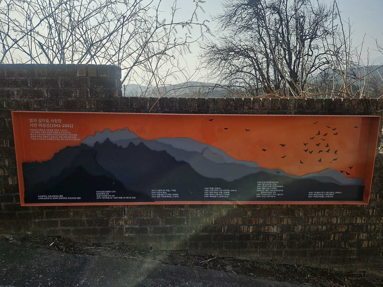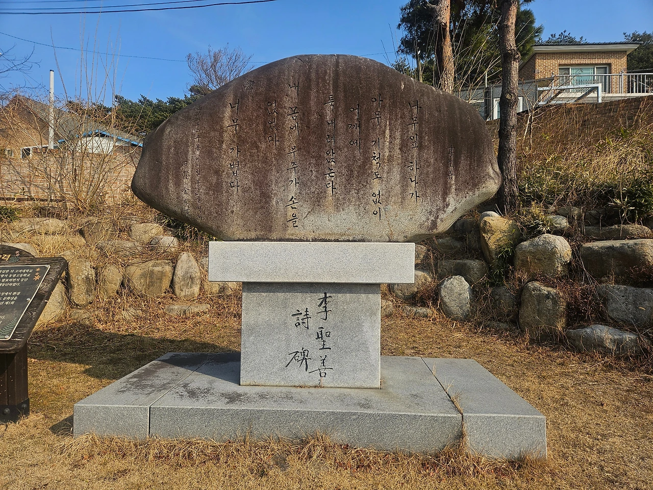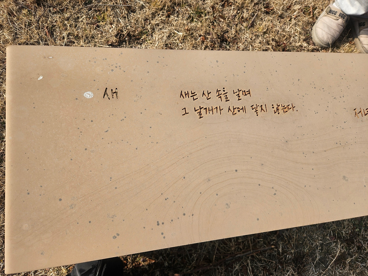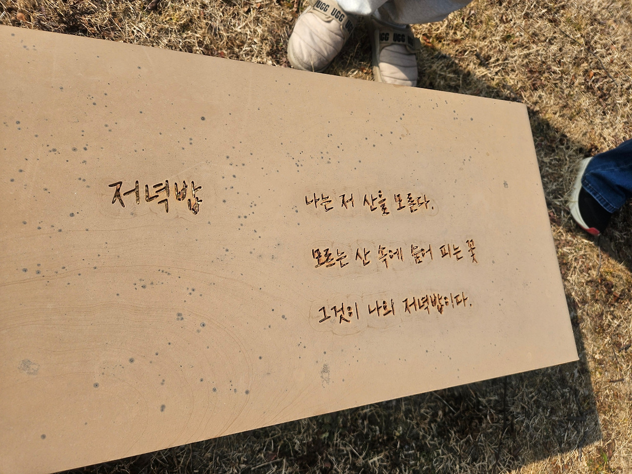 시비에는 미시령 노을이 새겨져 있었다. 얼룩이 져 가까이 다가가지 않으면 글씨를 읽기 어려웠다. 조금만 더 관리되었더라면 하는 아쉬움이 남았다. 주변의 벤치에도 시인의 대표작인 ‘저녁밥’과 ‘새’가 음각으로 파여있었다. 바닥까지 보이는 글씨들은 지금은 누런 소여물 색이지만, 새싹이 올라오는 봄이 되면 싱그러운 초록색 글자로 바뀔 것이다.