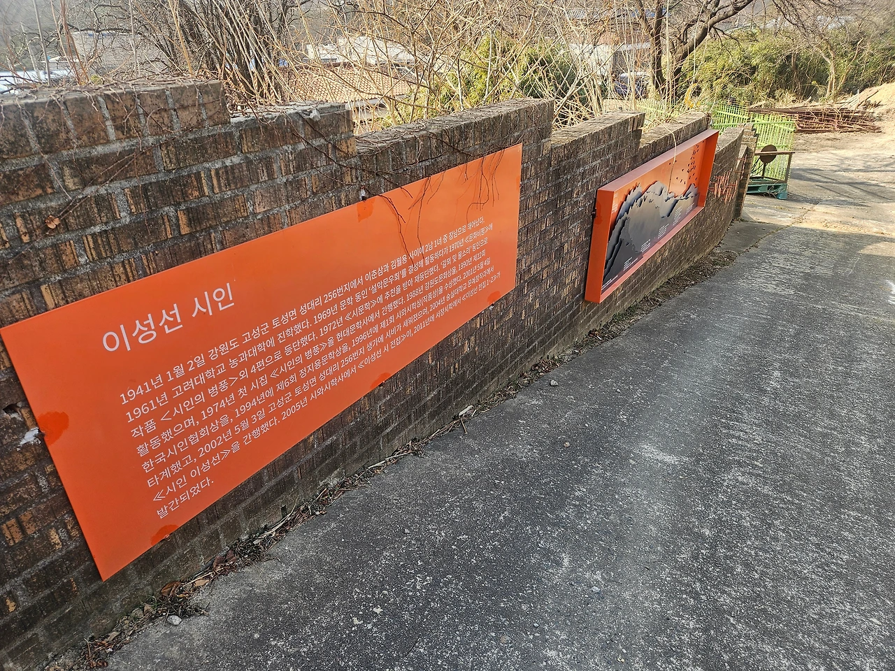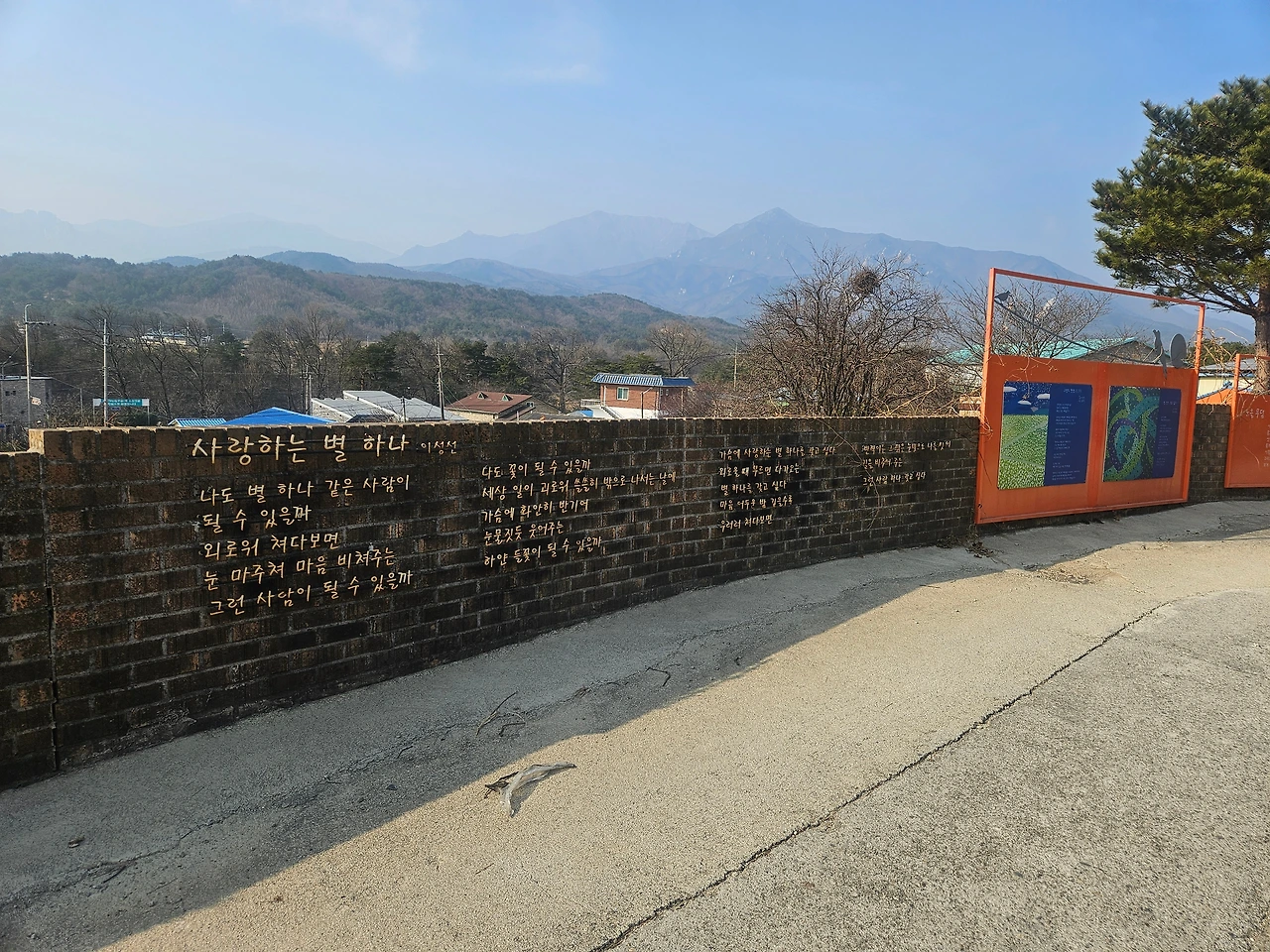 그런 이성선 시인의 시비가 고성군 토성면에 있다. 들뜬 마음으로 시비가 있는 곳으로 향했다. 토성면에서도 안쪽으로 꼬불꼬불한 시골길을 들어가면 성대리라는 작은 마을이 나온다. 탁 트인 설악산과 울산바위가 가까이 보이는 마을이다. 시비로 들어가는 입구의 팻말은 이성선 시비라고 적혀 있었다. 마을 초입의 정자 앞에 차를 세워두고 걸어 들어갔다. 좁은 길을 따라 들어가니 담벼락에 이성선 시인의 시 ‘사랑하는 별 하나’가 적혀 있었다. 이 시를 시작으로 ‘빈 산이 젖고 있다’, ‘노을 무덤’ 등 대표작들이 이어졌다. ‘미시령 노을’만 알고 있던 나는 천천히 시를 읽어 내려갔다. 자연을 우주처럼 바라본 그의 시는 아주 맑았다.