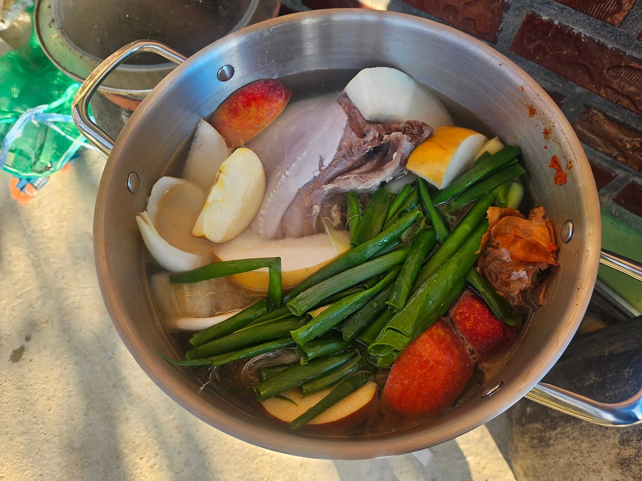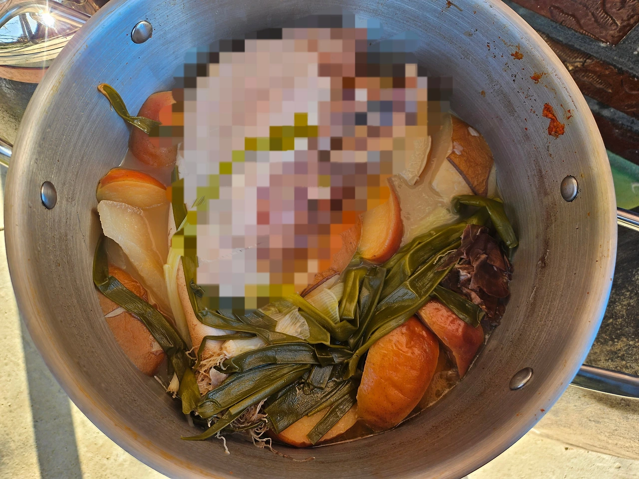 한번 와르르 끓은 물에 엄마가 이것저것 넣기 시작했다. 파, 사과, 배, 양파껍질. 근데 중요한 한 가지가 보이지 않는다. 우리 집에서 수육을 할 때 꼭 들어가는것 쌍화탕이다. 쌍화탕에는 당귀, 감초, 황기, 작약, 생강, 숙지황, 대추, 계피 등이 들어있다. 이 한 병만 넣어도 다른 재료 없이 고기 특유의 잡내를 충분히 잡아준다. 이보다 가성비 좋은 재료가 없다. 그런데 이번 우설 수육에는 쌍화탕을 넣지 않았다. 엄마에게 쌍화탕은 넣지 않는 거냐 물으니, 기본 재료가 좋기 때문에 굳이 넣지 않아도 된다고 한다. 이렇게 엄마에게 하나 더 배운다.