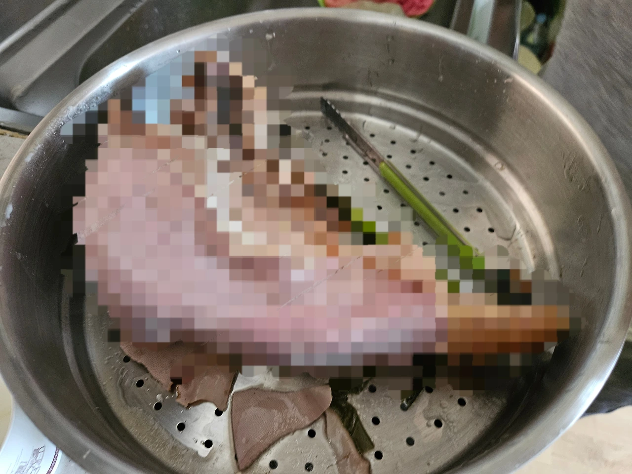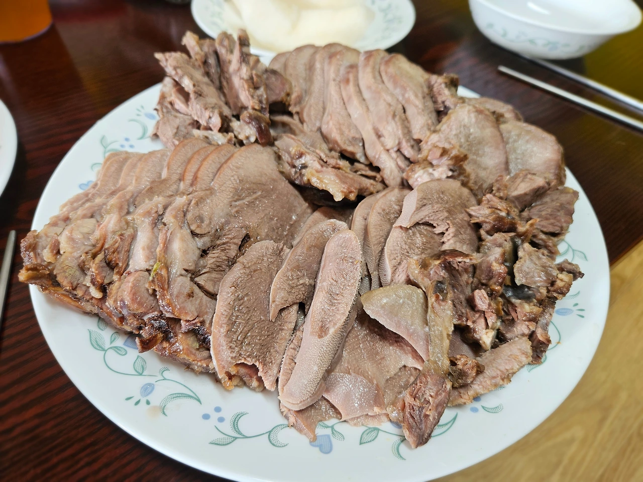 조금 식힌뒤에 자르려고 고기를 건져 올렸는데, 이게 웬일인가. 우설이 손질되어 있지 않다. 우설은 표면에 살짝 두껍고 껄끄러운 껍질이 한 겹 있는데 그걸 벗겨내야 한다. 다 벗겨진 상태로 배송된 건 줄 알았는데 껍질이 벗겨졌는지 착각할 정도로 깨끗하게 씻어서 배송된 것이었다. 혹시나 해 껍질을 벗겨보니 다행히 잘 벗겨진다. 좀 뜨겁긴 하지만 맛있는 수육을 위해서라면 이 정도 뜨거움쯤이야 참을 수 있다. 오히려 푹 익혀낸 덕분에 손질이 수월하다. 벗겨낸 껍질은 마당의 동경이에게 간식으로 던져줬다. 산해진미라도 주는 양 연신 꼬리를 흔들며 맛있게 먹는다.