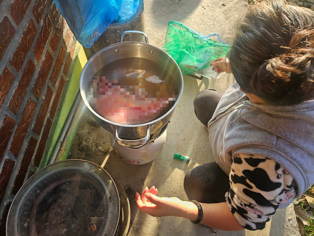 수육을 올려두고 본격적으로 김치를 버무렸다. 김치를 버무리는 동안 수육이 끓고 있었고 마당 한가득 맛있는 고깃국 냄새가 가득했다. 김장이 마무리되니 수육도 얼추 다 익었다. 김장하느라 지저분해진 마당을 정리하고 해바라기 버너의 불을 껐다. 뚜껑을 여니 잘 익은 수육 냄새가 코를 찌른다.