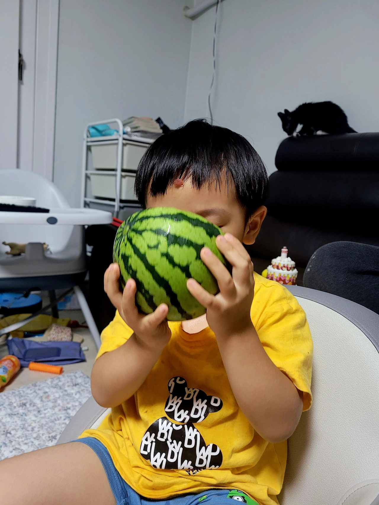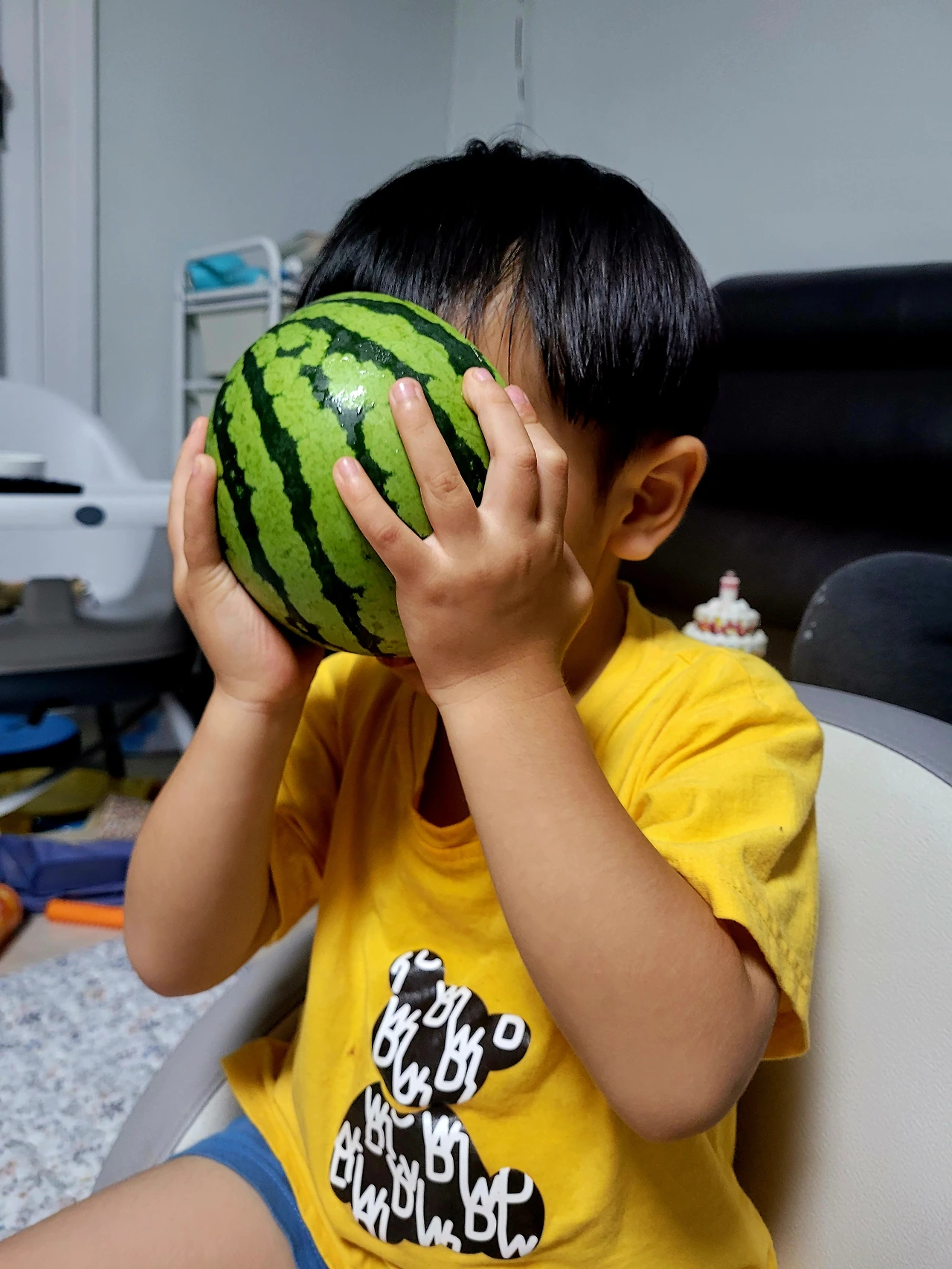 두 통은 고무다라이에 수돗물을 받아 담가두고 한 통은 도마 위로 올렸다. 처음 써보는 칼이였지만 엄마가 했던 것을 기억해 조심스레 칼을 수박에 가져다 댔다. 얼마나 잘 익었는지 별로 힘을 주지 않았는데도 쩍하고 벌어지며 새빨간 속살을 드러냈다. 숭덩숭덩 잘라 부엌 바닥에 그대로 앉아 수박을 먹기 시작했다. 달지 않으면 어쩌냐고 하는 고민이 무색하게 수박은 너무 달고 맛있었다. 트럭에 있던 것을 시원하게 식히지도 않고 자른 것이라 뜨뜻미지근한 수박이었지만 너무 맛있었다. 삼각형으로 잘라먹어 보기도 하고, 만화에 나오는 것처럼 기다랗게 잘라 온 얼굴에 수박즙을 묻혀가며 먹어보기도 하고, 그렇게 혼자 수박 반 통을 다 먹었다. 남은 반 통은 냉장고에 밀어 넣어두었다.