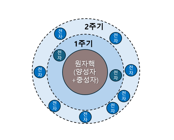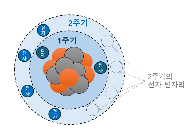 아래 그림으로 보면 이해가 비교적 쉬운데, 모든 '전자'는 원자핵과 가까운 1층(1주기)에서 최대 2개까지만 위치할 수 있고, 2개일 때 가장 안정적이게 된다.