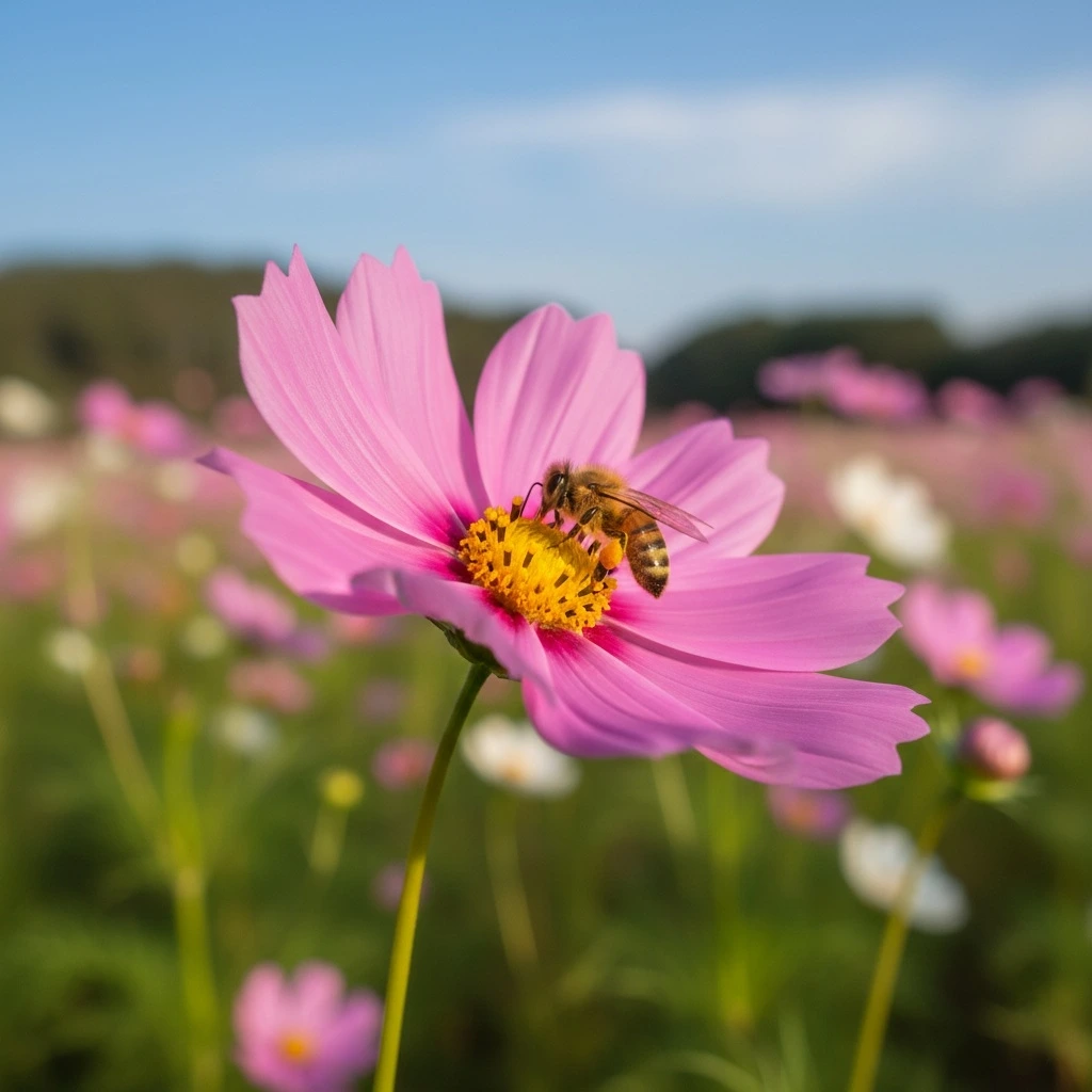 꿀벌은 이 꽃 저 꽃 옮겨 다니며 꿀을 모으고, 그 과정에서 코스모스 수술의 꽃가루를 다른 꽃의 암술에 옮겨 수정을 돕는다. 그 결과 수정된 씨앗이 만들어져 다음 세대의 코스모스가 태어난다.