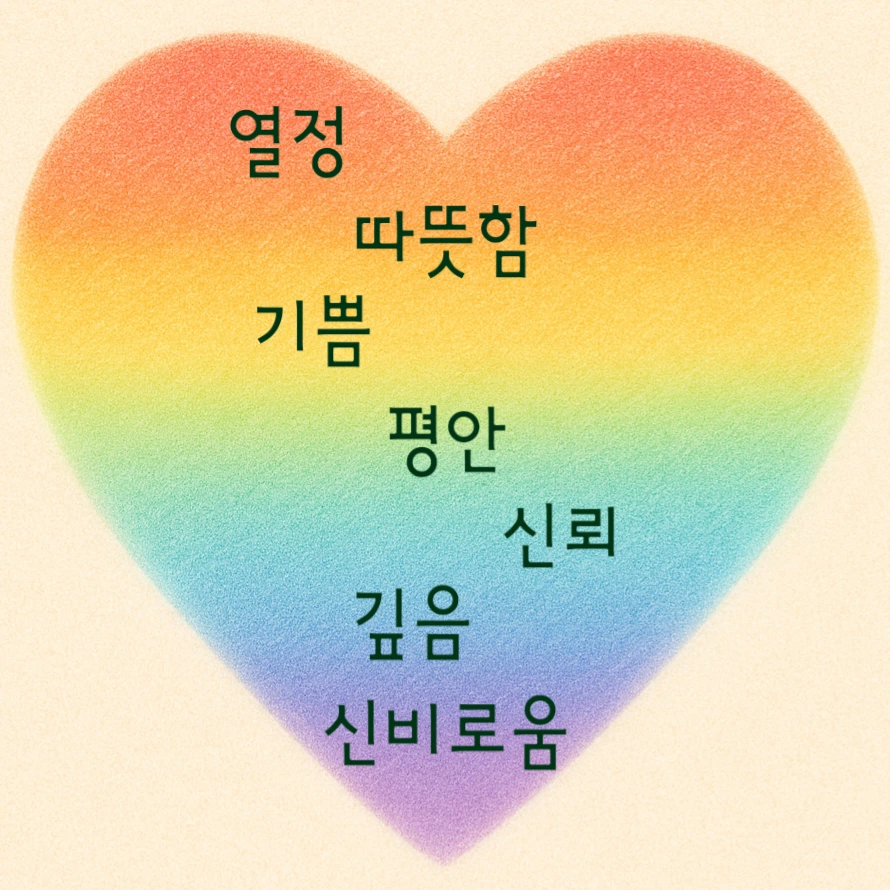 처음에는 빨간색의 열정으로 시작해서, 따뜻함의 주황, 기쁨의 노랑, 평안의 초록, 신뢰의 파랑, 깊은 남색, 신비로움의 보라까지...