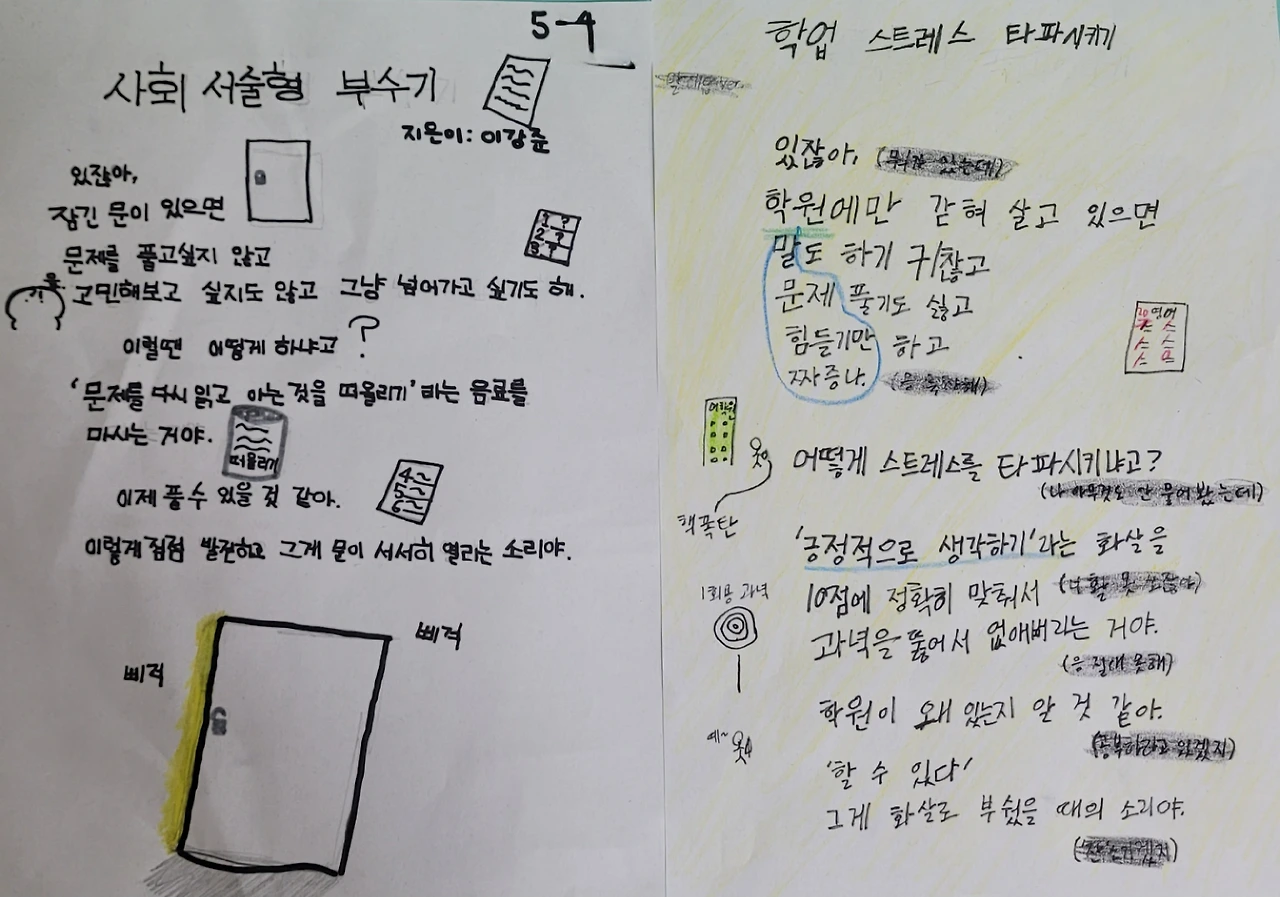 초등학교 5학년 2학기 국어 첫 장에는 ‘벽 부수기’라는 작품이 등장한다. 공감의 방법으로 마음의 벽을 허물어간다는 내용의 시를 아이들과 바꾸어 적어봤다. 먼저 부정적인 감정을 겪은 경험을 꺼내보며 각자의 벽을 떠올렸다. 안타깝게도 이날 수학 문제, 사회, 잔소리, 학업 스트레스의 벽이 끊기거나 잘려 나가고 부서졌다. 그 방법으로 아이들은 ‘문제를 다시 읽고 아는 것을 떠올리기’ 음료를 마시고, ‘긍정적으로 생각하기’ 화살을 10점 과녁에 정확히 맞추며 ‘자신감 가지기’라는 약을 밥에 비벼서 야무지게 먹었다. 친구의 벽과 깨트릴 무기에 아이들은 공감했다. 때로는 같은 감정을 지녔다는 사실 하나에 위로를 받는다.