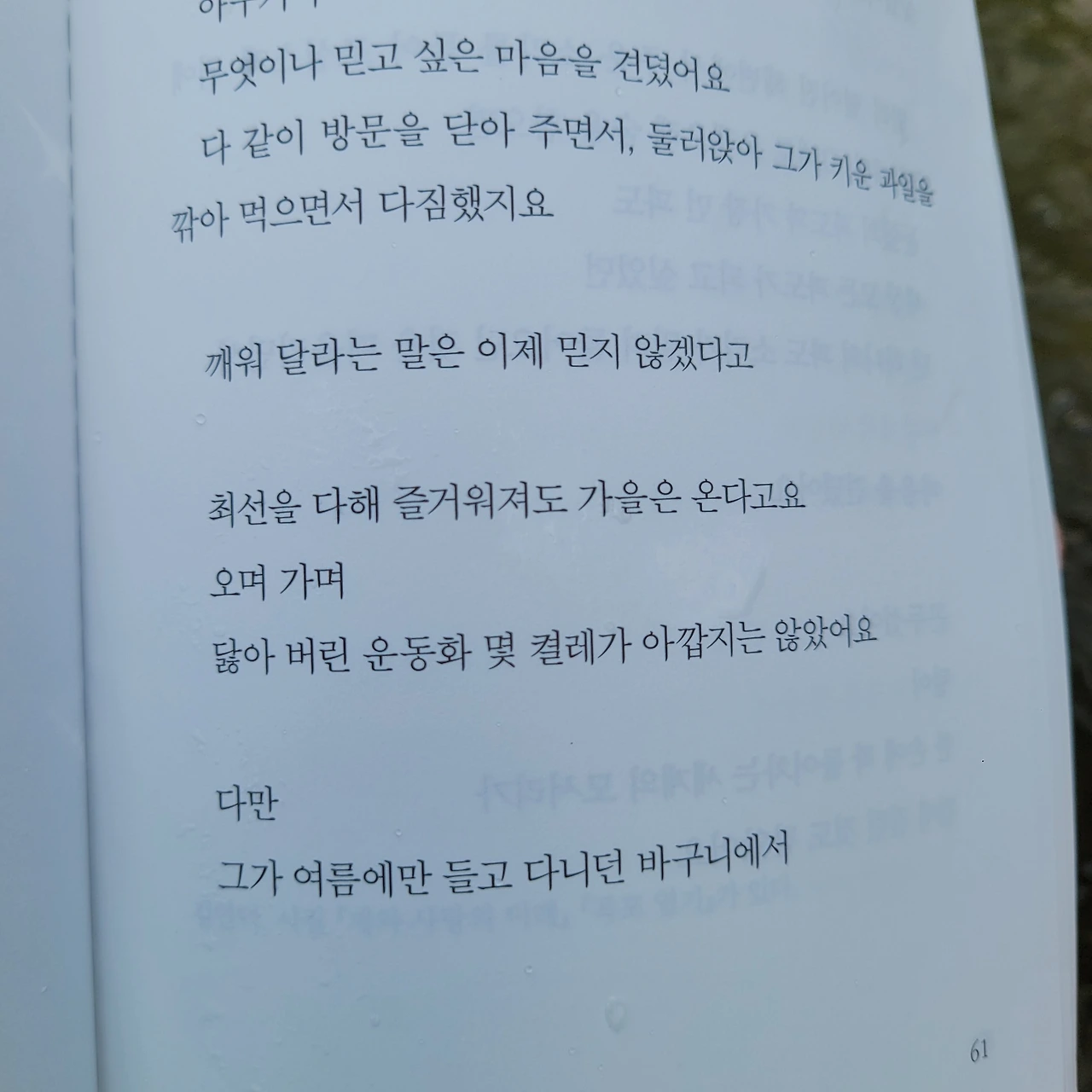 끝나지 않을 것 같던 방학이 어느새 여름을 데려가고 있다. 지글지글 데워진 시멘트 위에서 길을 잃는다면 아마 오래 버티지 못하고 부글부글 끓다 타버릴 것이다. 달궈진 감정이 지쳐 소진되는 시기는 다음 계절이 오듯 자연스레 온다. 혼자서는 힘에 부칠 때 탄성을 이용하는 게 필자의 벽 부수기 방법이다. 먼저 가로막힌 벽에 느끼는 한탄을 충분히 표현하고, 쏠린 신경을 전환할 사소한 무언가에 감탄하며 마지막으로 일상을 찾아 되돌아가려는 성질에 몸을 맡기는 것이다. 처서를 막 지난 여름날, 잠자리가 낮게 나는 계곡물에 들어가 쏟아지는 물소리를 들으며 곱씹던 시의 한 구절이 떠오른다. ‘최선을 다해 즐거워져도 가을은 온다고요.’ 마찬가지로 최선을 다해 슬퍼져도 가을은 옵니다. 온다고요.