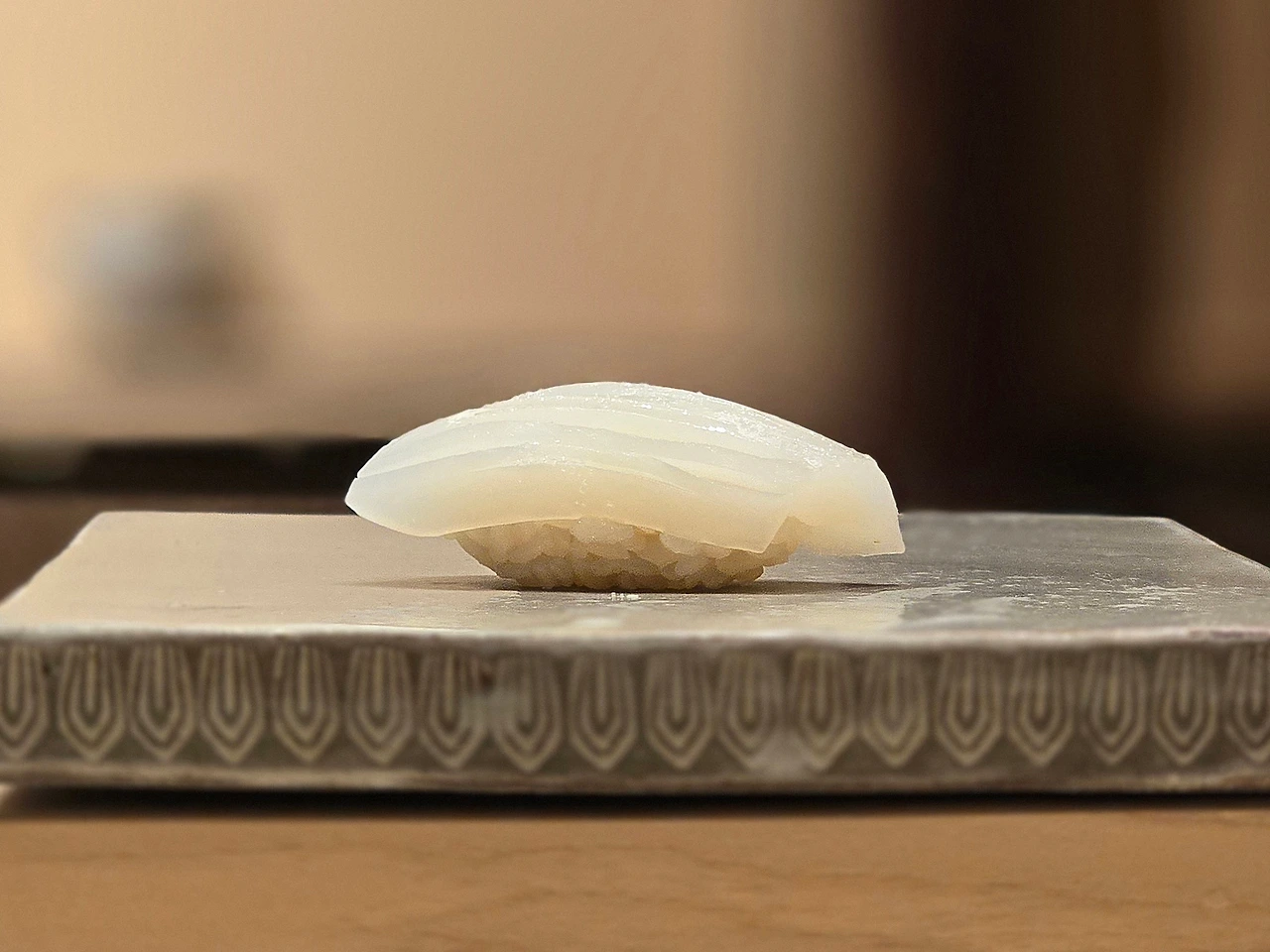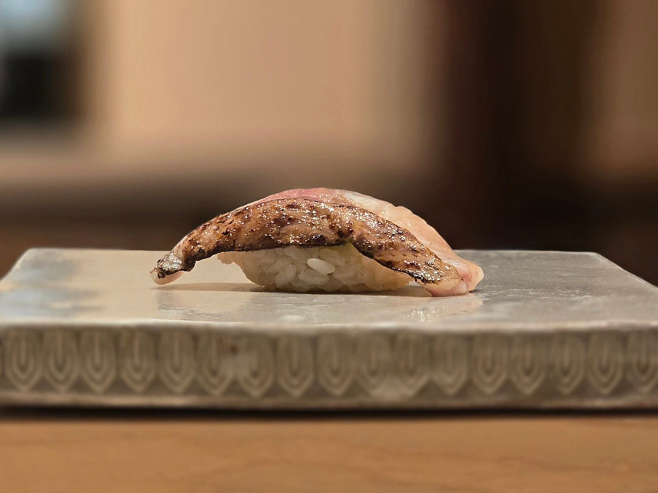스시 코스의 시작은 시마아지. 기름진 감칠맛이 탱글한 샤리의 산미와 어우러져 침샘을 자극한다. 입맛을 빠르게 끌어올리는 시작이다. 두 번째는 껍질만 살짝 아부리한 벤자리돔. 고소한 풍미를 응축시키면서도 자극적인 불향은 남기지 않는 섬세한 조율로, 입안을 강하고 부드럽게 휘감는다. 그 다음은 스미이카. 녹진한 식감과 은은한 단맛으로 고조되던 흐름을 잠시 낮추며 숨을 고른다. 그러다 '이제 슬슬 정점으로 진입하려나' 싶을 때, 갑자기 자그마한 꼬치에 끼운 오징어 다리 구이가 귀엽게 등장한다. 안정적인 흐름 중간에 잔재미 하나를 쓰윽 밀어 넣는 감각. 하시라답다.
