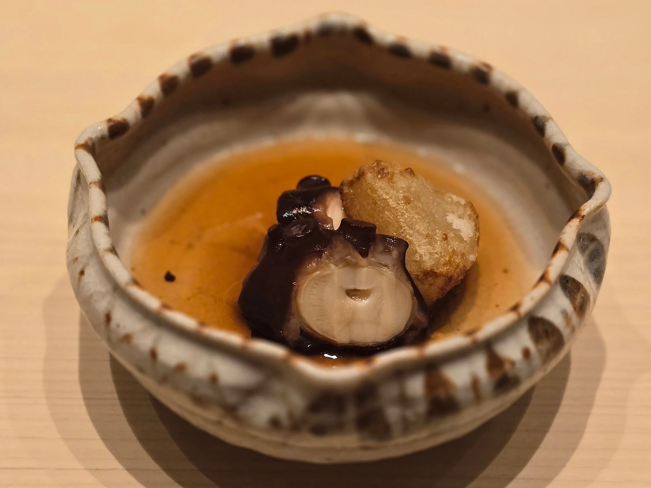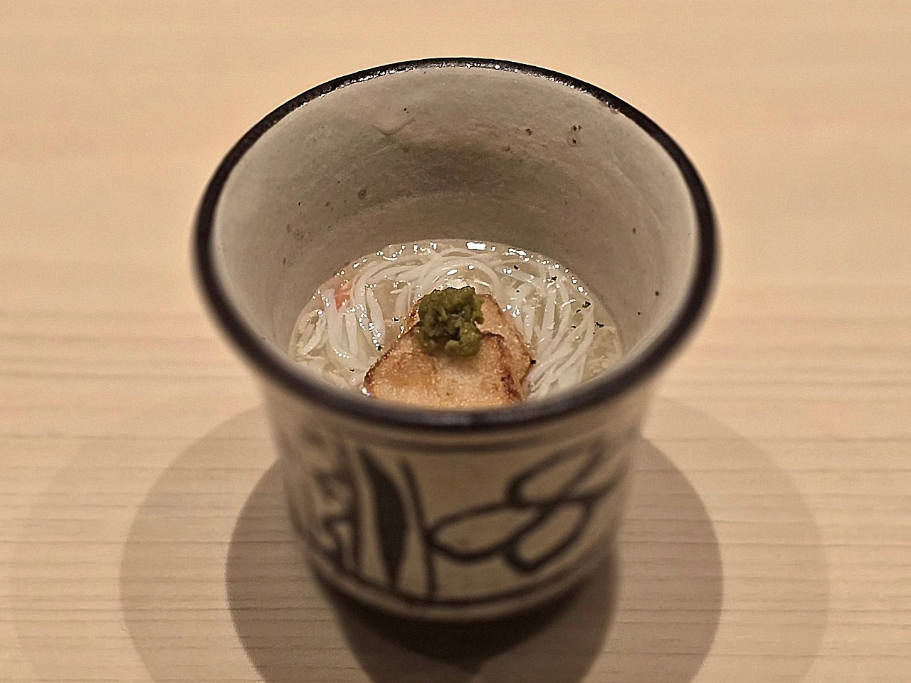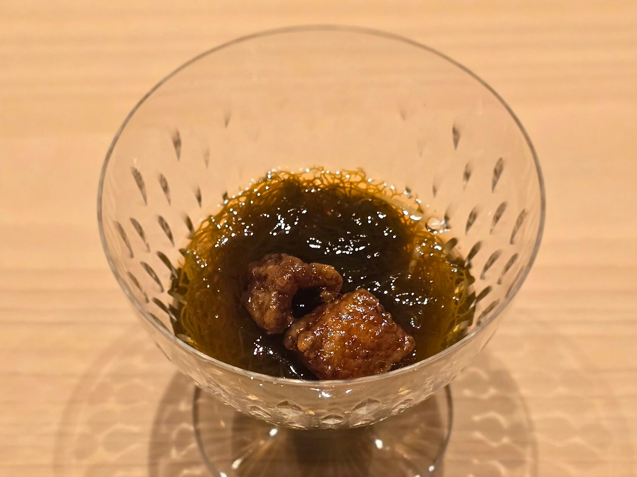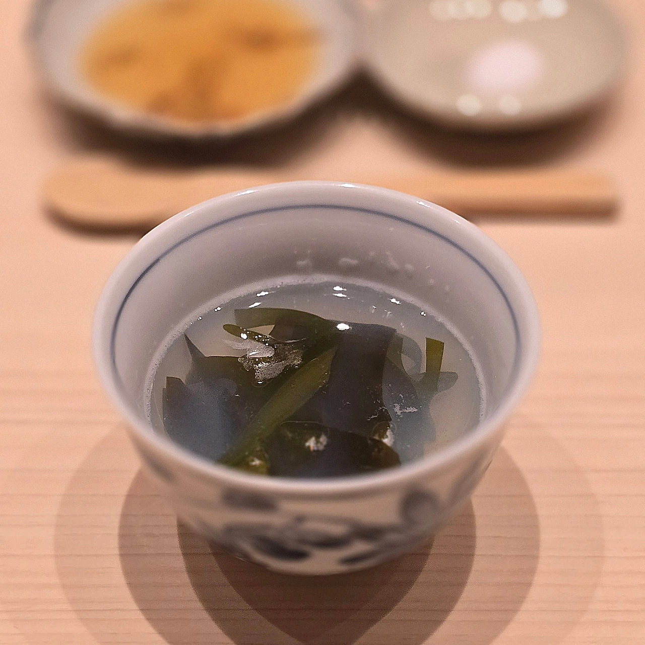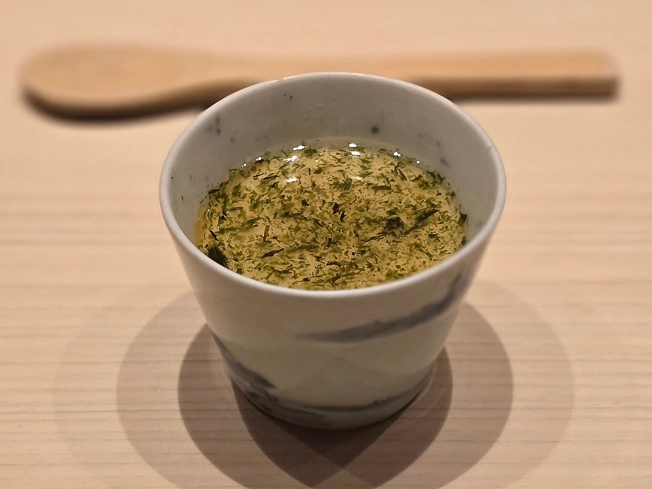 모시조개로 만든 스이모노. 맑은 국물을 머금으니 감미로운 바다의 풍미가 따뜻하게 스며들고. 제철 생미역을 폰즈에 살짝 적셔 음미하니 탱글한 식감과 짭짤한 고소함, 상큼한 감칠맛이 입맛을 깨운다. 이어질 다음 요리를 기대하게 만드는, 싱그러운 봄바다를 담은 한 그릇.