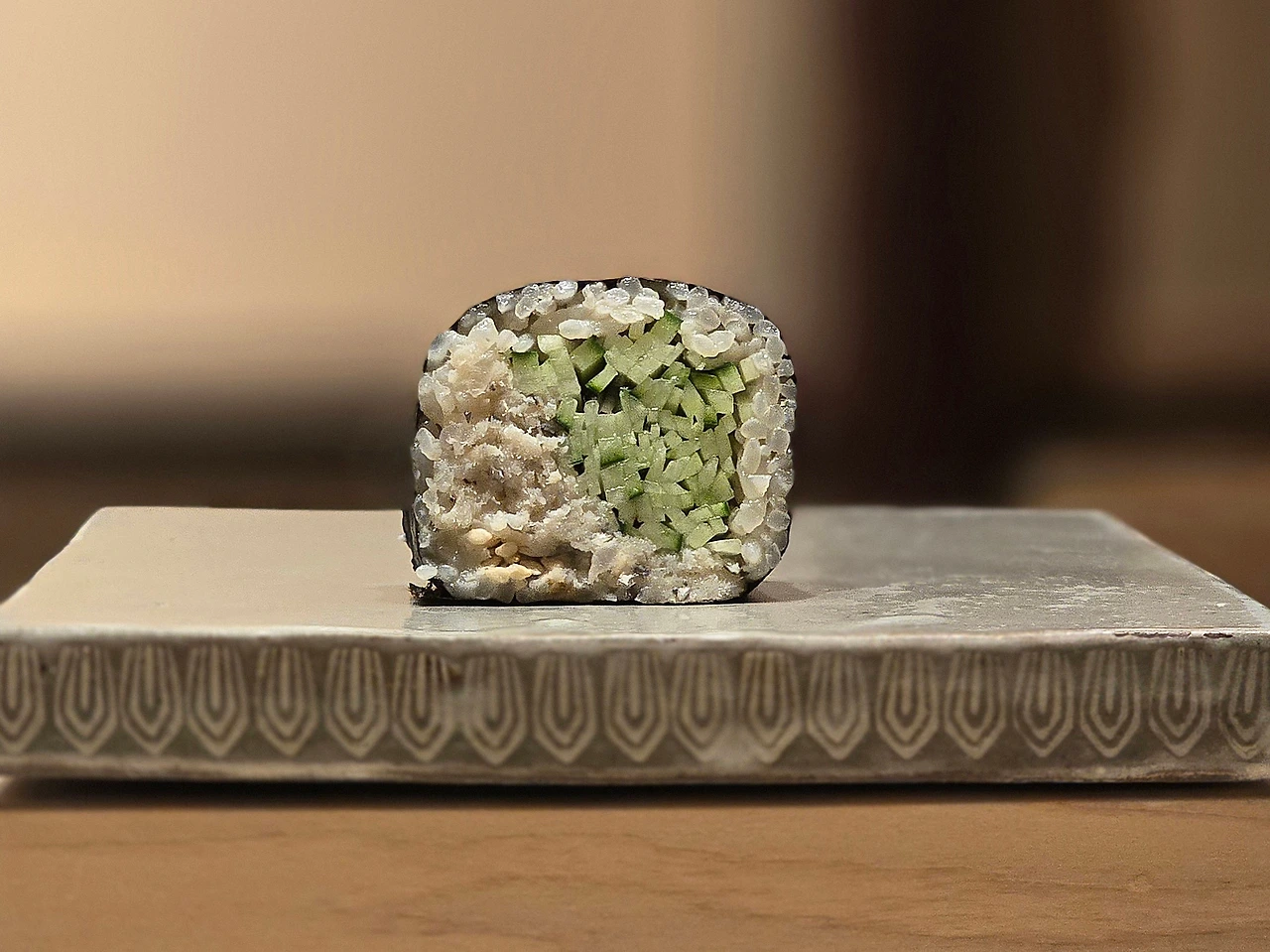 후반부는 완급 조절이 핵심이다. 단새우와 우니의 가벼운 부드러움으로 잠시 무게를 덜어냈다가, 프와그라를 연상케 하는 안키모로 다시 묵직함을 더한 후, 아나고큐리마끼, 훈연참치마끼, 간뾰마끼로 산뜻하고 깔끔하게 입맛을 환기시킨다. 마지막으로 맑고 따뜻한 네기마지루*로 식사의 잔여감을 말끔히 정리한 다음, 달콤한 타마고야끼와 상콤한 천혜향 양갱으로 마무리한다. 과시보다 균형을 택한 구성이다.