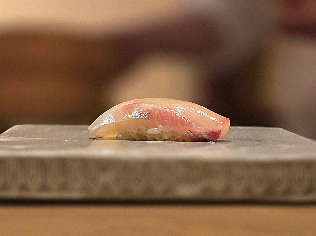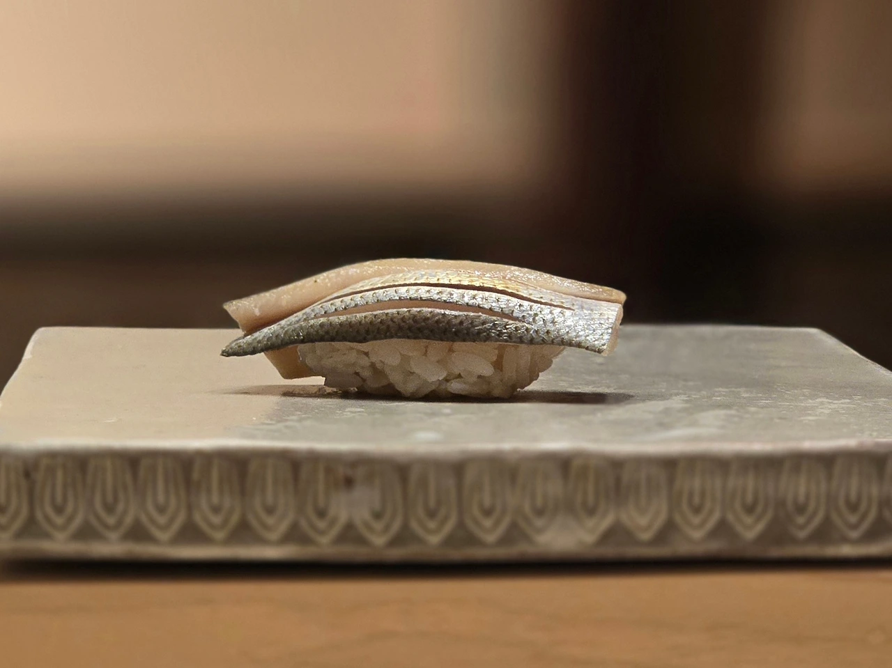 스시 코스의 정점은 참다랑어와 전어. 먼저 아카미와 오오토로가 연달아 등장하며 참다랑어의 양극단을 밀어붙인다. 화려한 산미와 감칠맛으로 긴장감을 주는 아카미와, 촘촘한 지방과 진한 고소함으로 묵직한 여운을 남기는 오오토로가 서로 대비를 이루며 클라이맥스까지 끌고 올라가다가, 최고조에서 강렬한 전어가 등장하는 흐름. 하시라의 전어는 숙성을 길게 하지 않아서, 과한 발효 향이 없으면서도 풍미가 관능적이다.