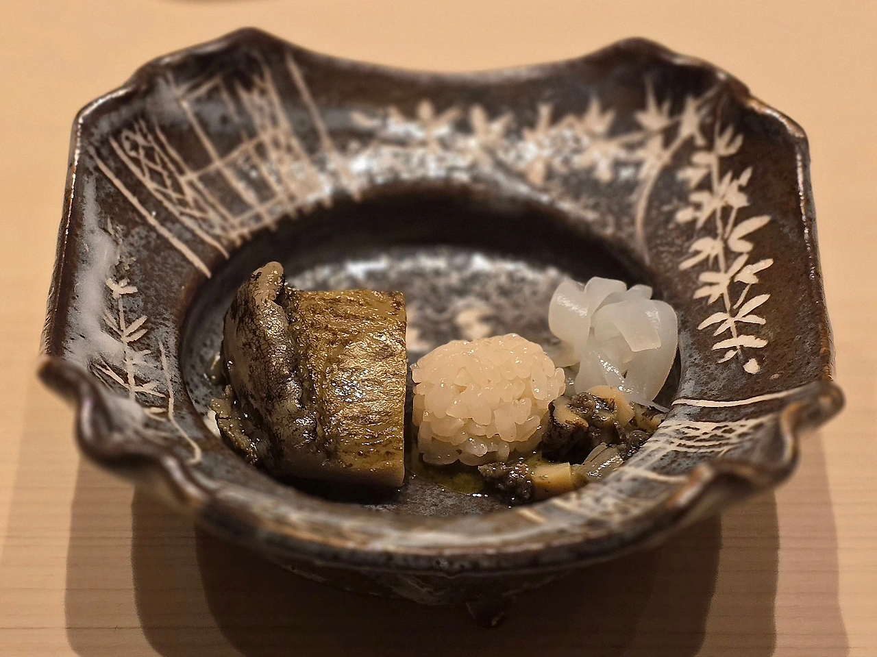먼저 자연산 찐 전복부터. 인위적인 단맛 없이 진하게 농축된 자연의 풍미가 가득하고, 촉촉한 식감이 편안하며 나긋나긋하다. 하지만 그 다음은 다르다. 쫀득한 무늬오징어, 쫄깃한 전복 자투리, 침샘을 자극하는 짜릿한 샤리, 녹진한 전복내장소스를 한데 비벼 입에 넣는 순간, 화려한 식감과 통통 튀는 균형감에 갑자기 정신이 번쩍 든다. 하시라의 시그니처 중 하나라 여러 번 먹어봤는데도 매번 놀랍다. 이 작은 그릇 안에 조밀하게 짜넣은 다양한 레이어가.