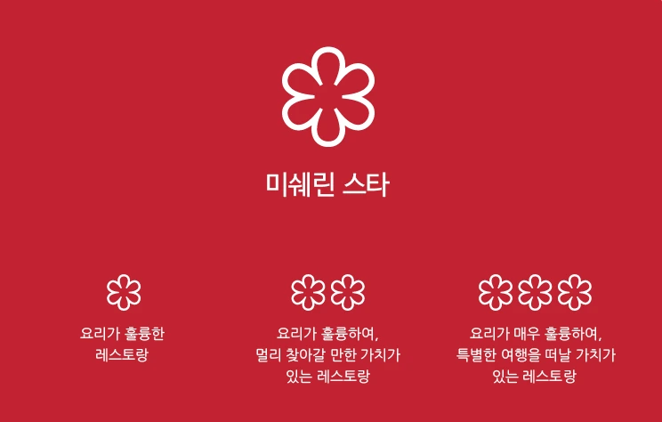 •3스타 : '요리가 매우 훌륭하여 특별히 여행을 떠날 가치가 있는 레스토랑'. 정점에 다다른 셰프가 예술의 경지에 오른 최상의 요리를 내는 곳이다. 3스타는 미쉐린에서 부여하는 최고의 영예다.