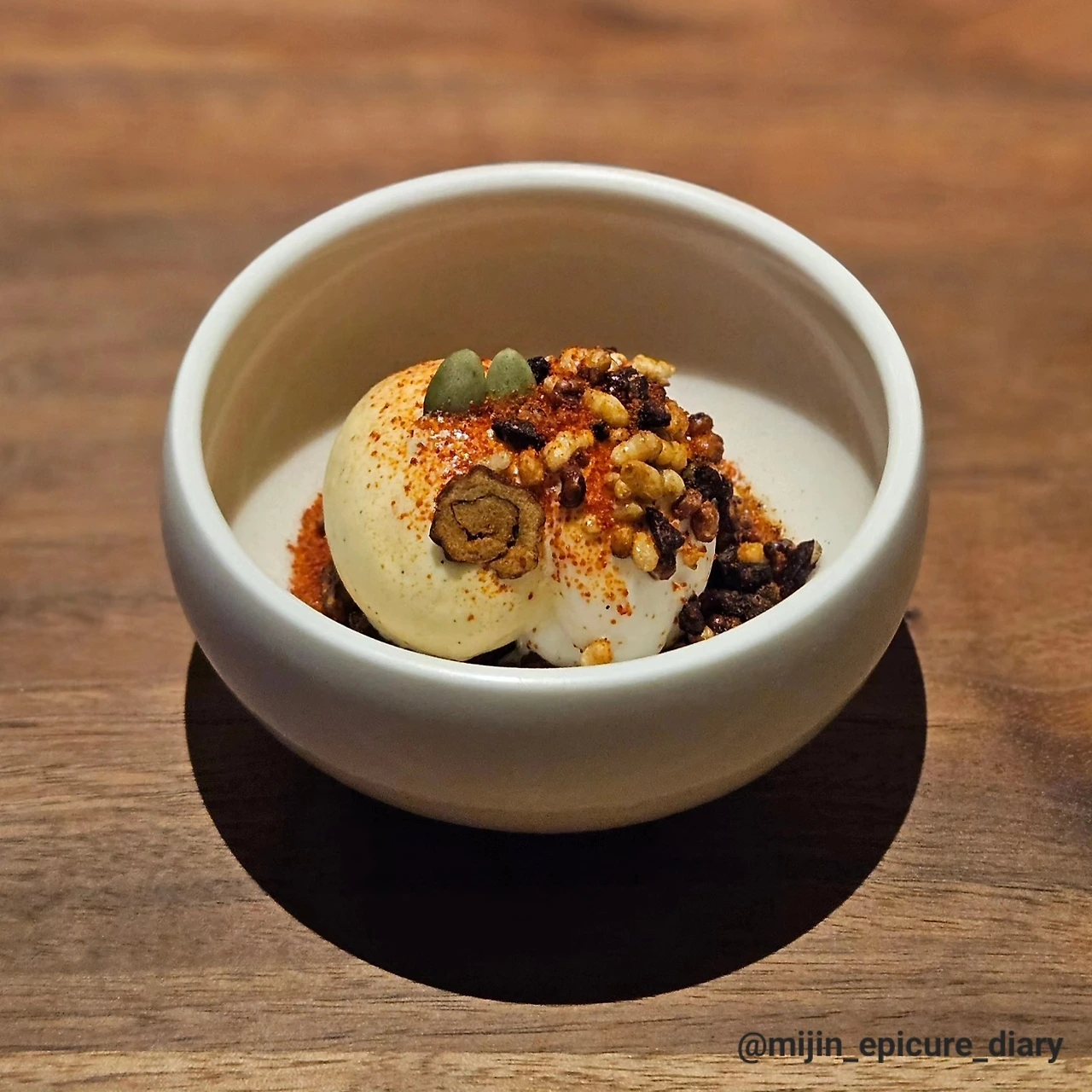 •장 트리오 : 2014년 밍글스의 시작과 함께 탄생한 시그니처 디저트로, '장'이 핵심이다. '된장' 크렘브륄레, '간장'으로 캐러맬라이징한 피칸, '고추장' 물에 삶은 곡물 튀밥, '고추장' 파우더, 바닐라 아이스크림, 위스키 폼의 복합적인 풍미와 식감이 층층이 쌓여 절묘한 조화를 이룬다. 11년 전 개발한 디저트 안에 최신 미식 트렌드인 '한식' '발효와 숙성', '스와이시(Swicy=Sweet+Spicy)', '지속가능성', '위스키'가 모두 들어있다는 것도 흥미로운 미식 포인트.