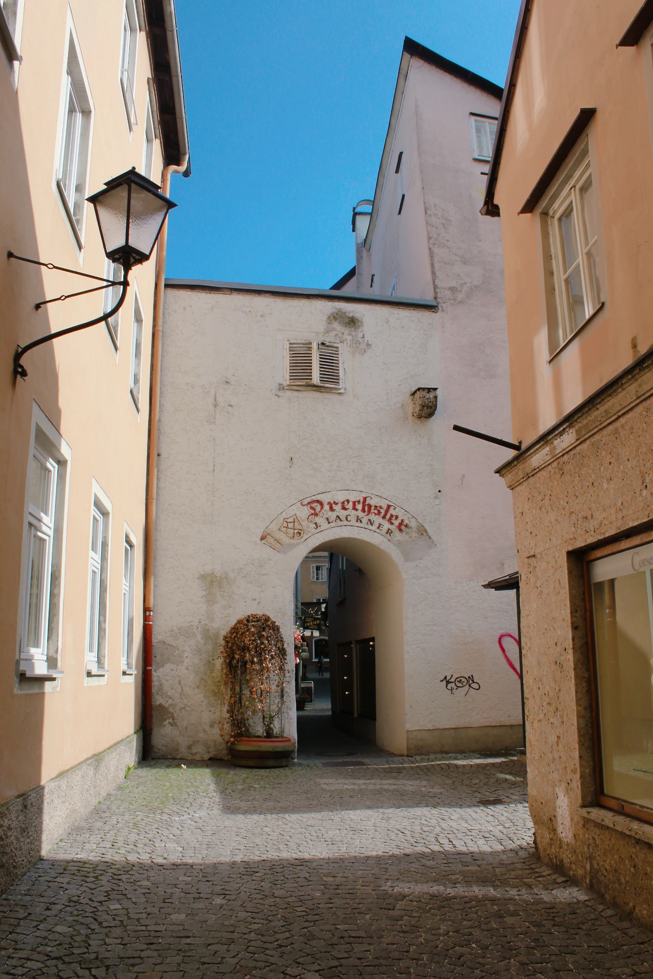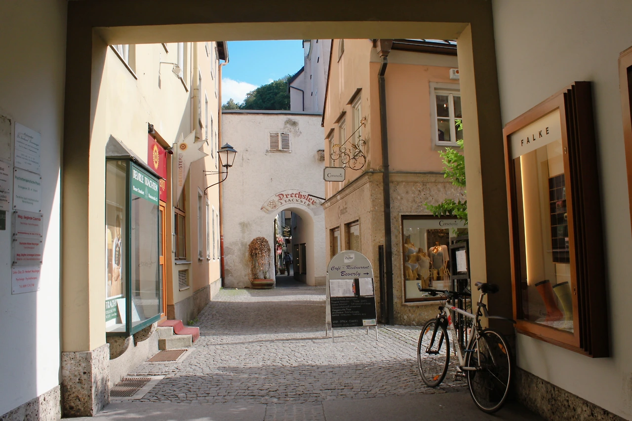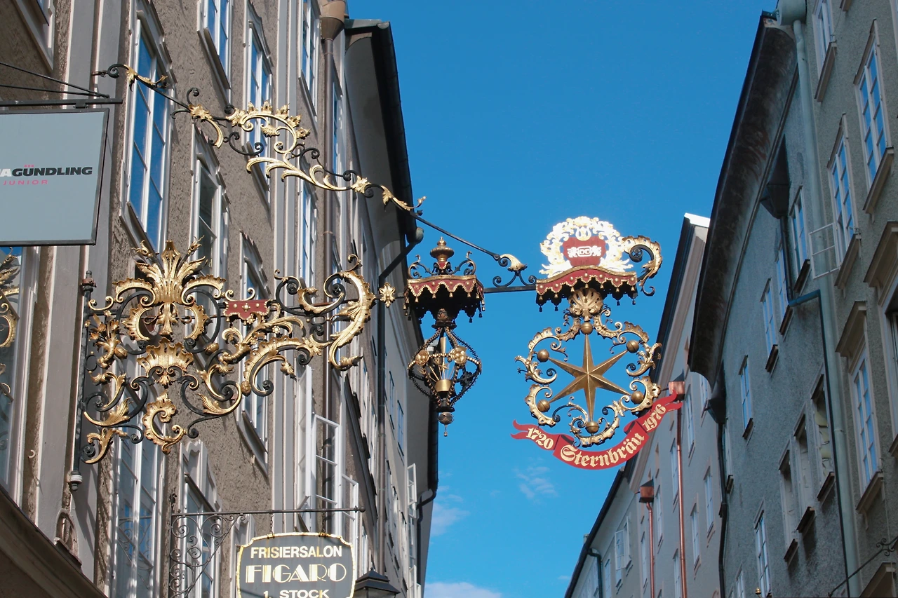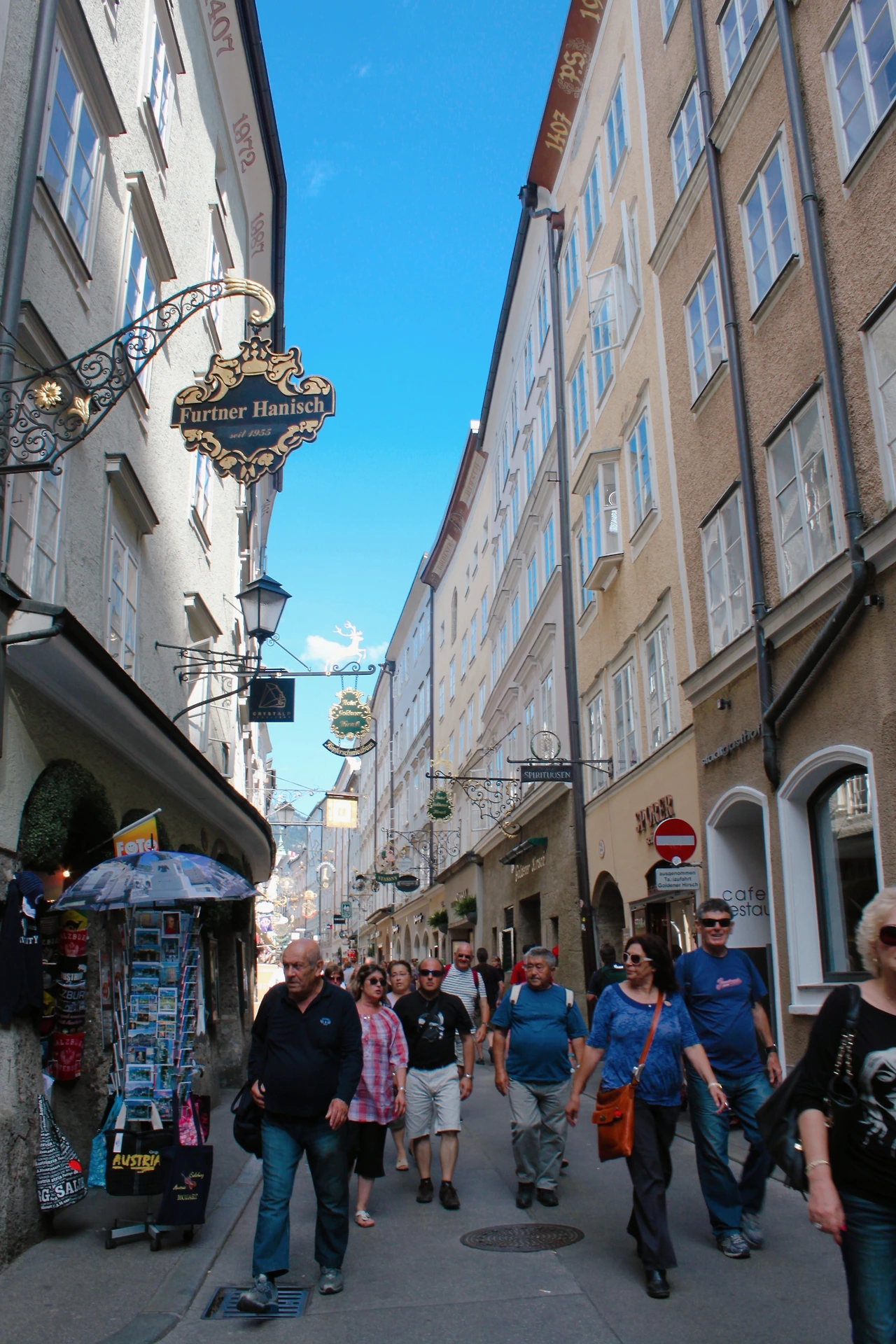 아까는 건너지 못했던 다리를 한가로이 건너본다. 새로운 세상이 펼쳐졌다. '게트라이데 거리(Getreidegasse)'에 있는 좁다란 골목 따라 아기자기하게 밀집된 상점들이 귀여웠다.