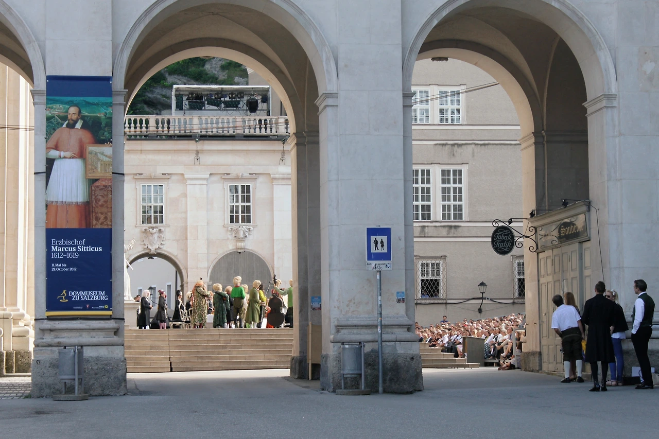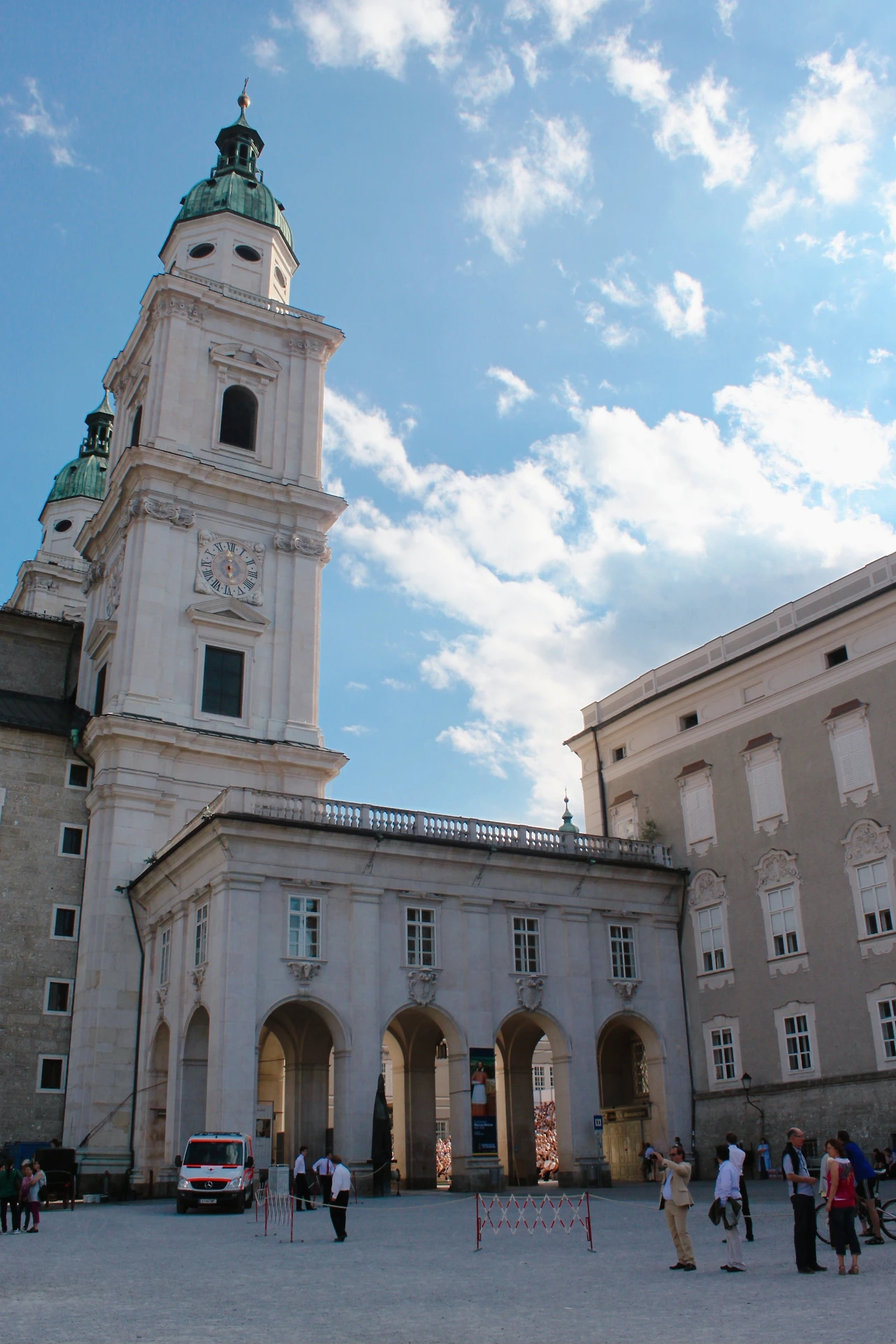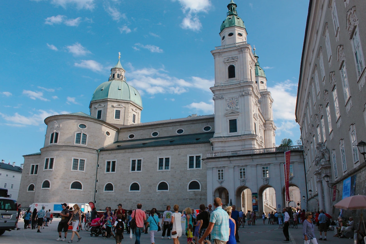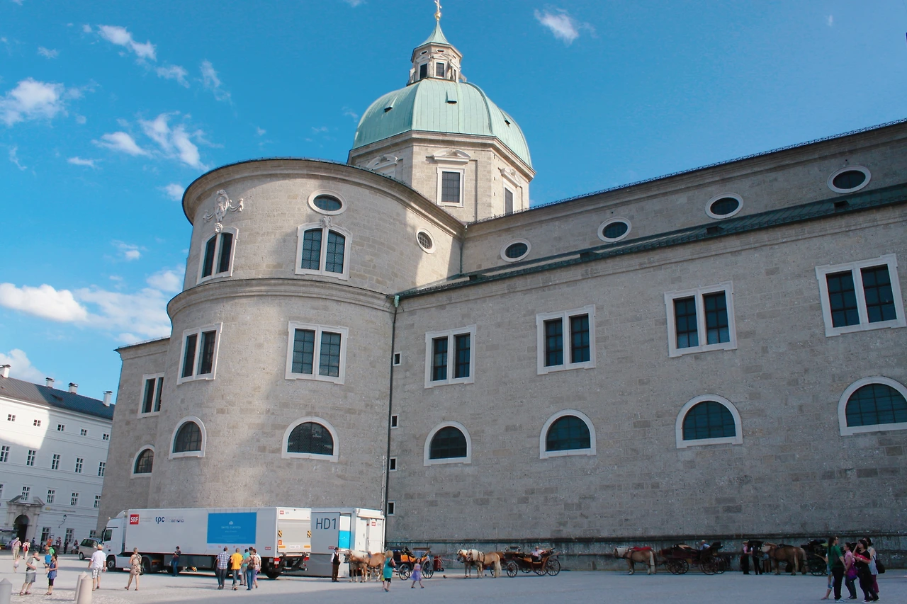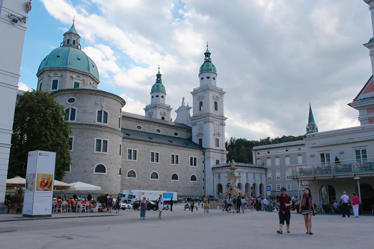 바로 뒤에는 장난감이 커진 것처럼 보이는 '잘츠부르크 대성당(Salzburg Cathedral)'이 우직하게 서있었다. 그 옆에 있는 돔광장에서는 연극공연이 한창이었다.