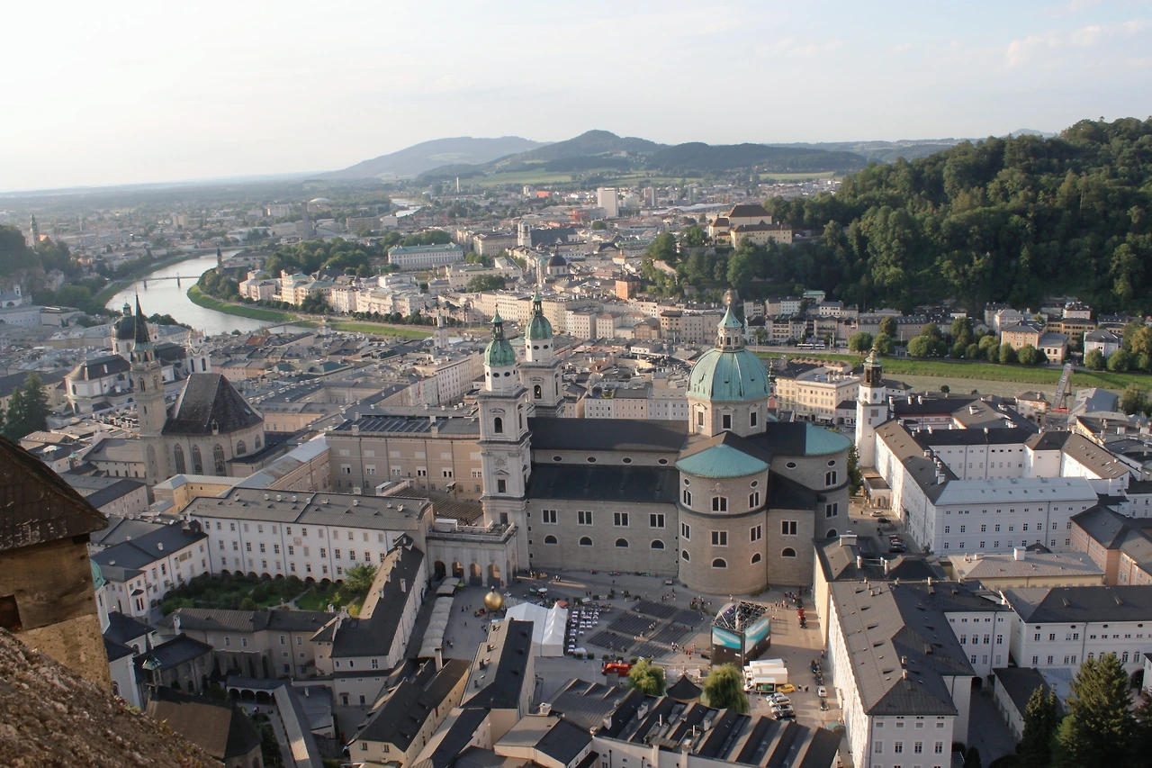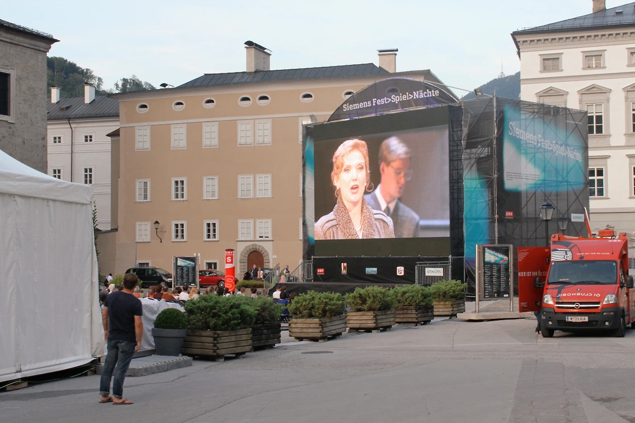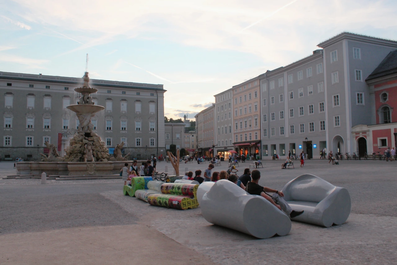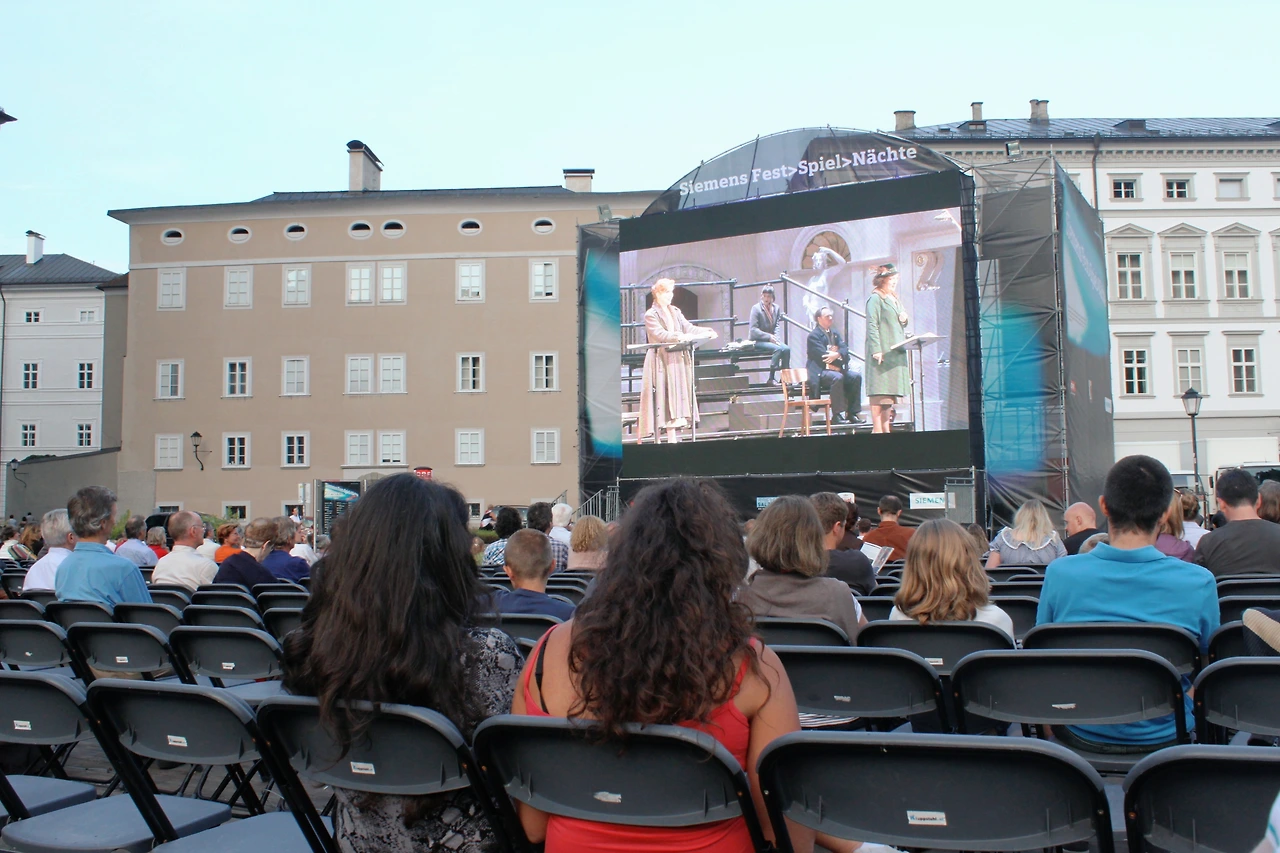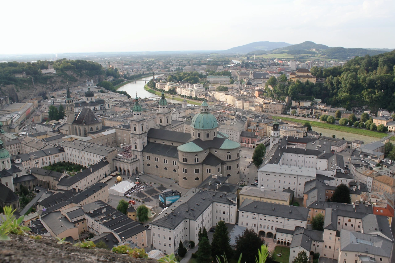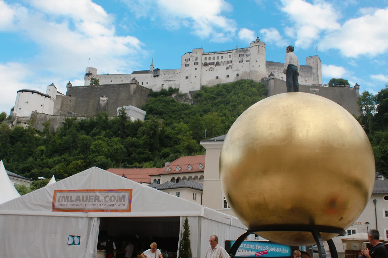 바로 뒤에는 장난감이 커진 것처럼 보이는 '잘츠부르크 대성당(Salzburg Cathedral)'이 우직하게 서있었다. 그 옆에 있는 돔광장에서는 연극공연이 한창이었다.