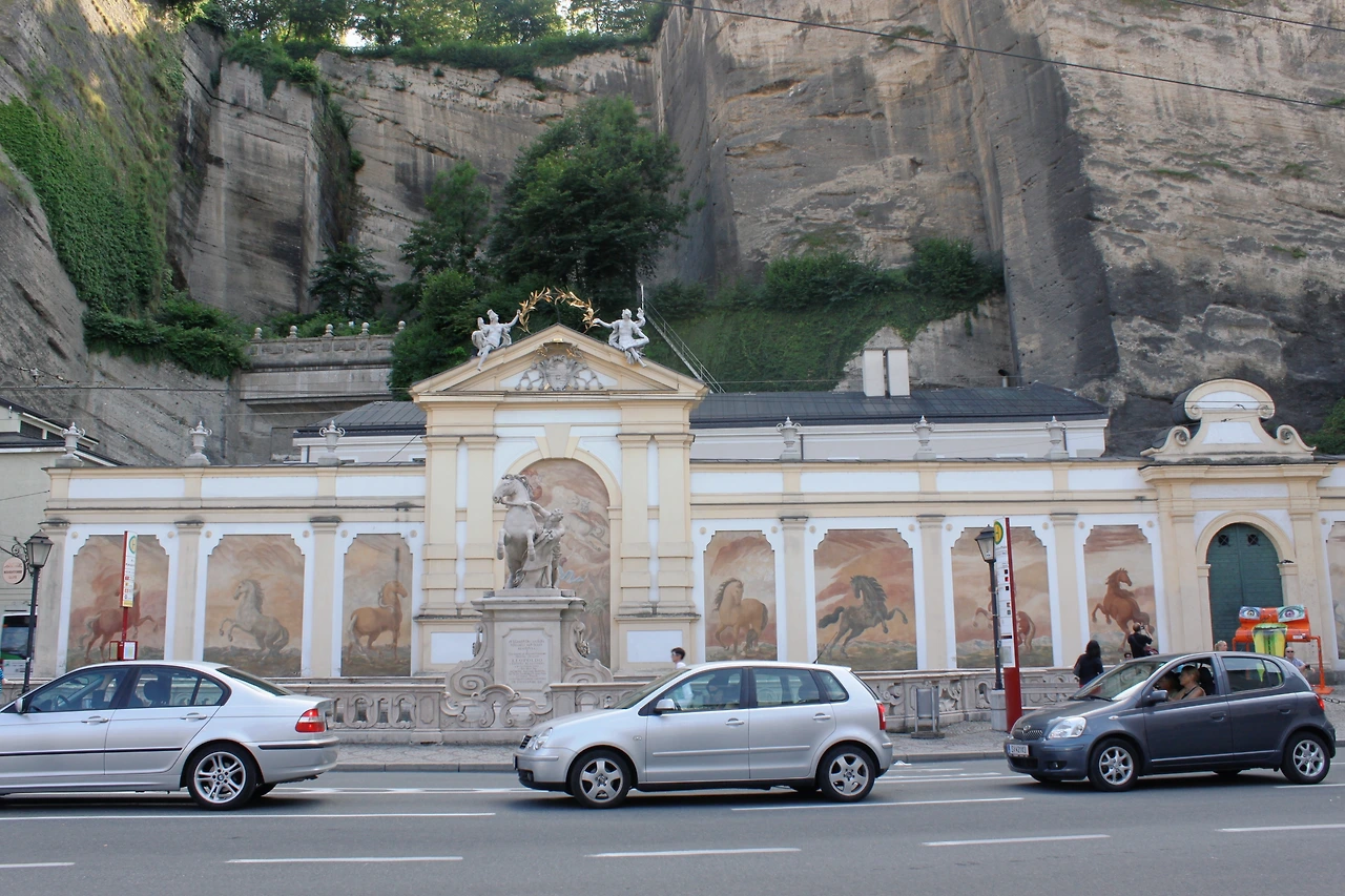 얼마 걷지 않아 말이 물을 마시 '페어데슈베메(Pferdesschwemme)'를 볼 수 있었다. 깎아지른 절벽을 병풍으로 가운데에 있는 말 동상과 다양한 포즈의 말 벽화가 인상적이다.