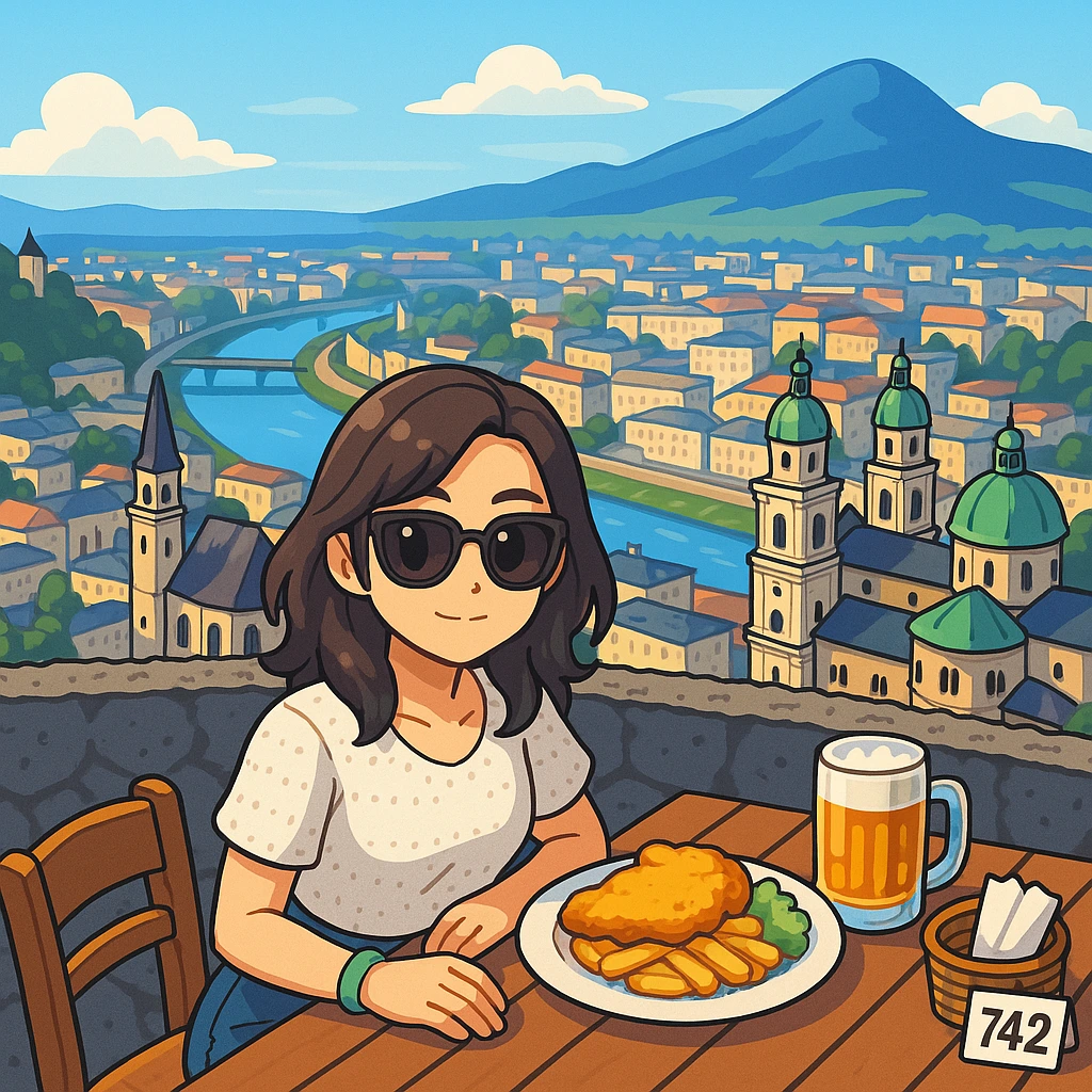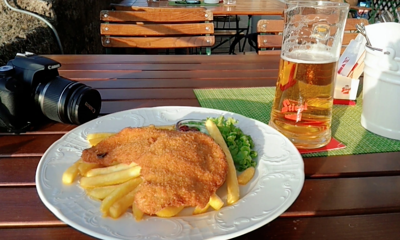 용기 내어 기회를 얻은 나는 앉은자리에서 아름다운 풍경을 독식하면서 세상에서 가장 시원하고 맛있는 맥주와 슈니첼을 먹었다.