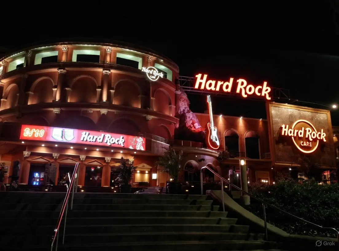 호수 한쪽에는 경비행기가 놓여 있었고, 건너편으로는 하드락 카페의 간판이 눈에 들어왔다. 잠시 안으로 들어가 볼까 마음이 흔들렸지만, 지금의 어둠과 고요가 더 마음에 들었다.