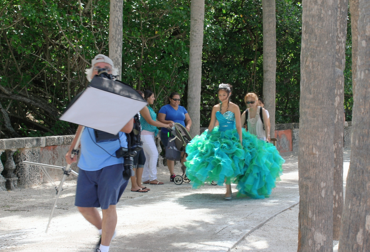 저 멀리 녹색 드레스를 입은 여자가 걸어오고 있다. 그녀를 따르는 사람들의 손에는 카메라와 반사판 등 촬영 장비가 들려 있다.