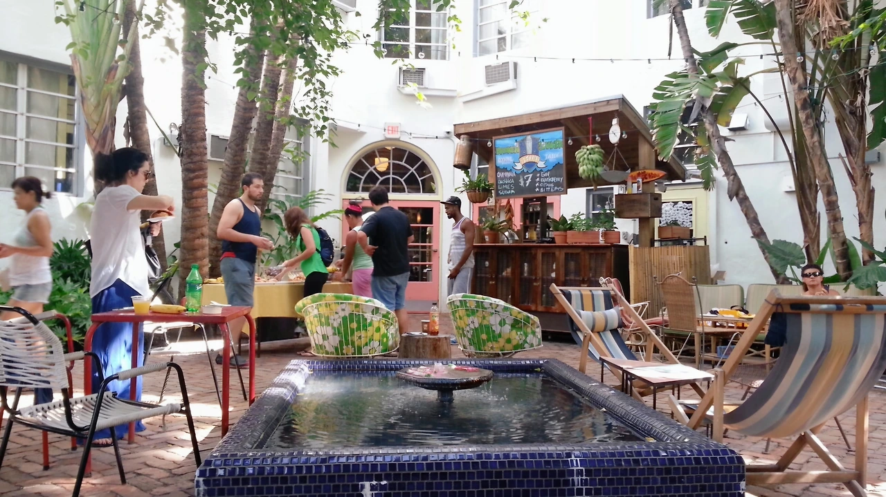 정원 한가운데에는 작은 분수가 졸졸 흐르고 있었고, 주변엔 개성이 넘치는 의자와 테이블이 곳곳에 놓여 있었다. 한쪽 테이블에는 빵과 과일, 주스가 가지런히 올려져 있었으며, 작은 공간 안에는 커다란 나무들이 심어져 있어 한층 더 싱그러운 분위기를 자아냈다.