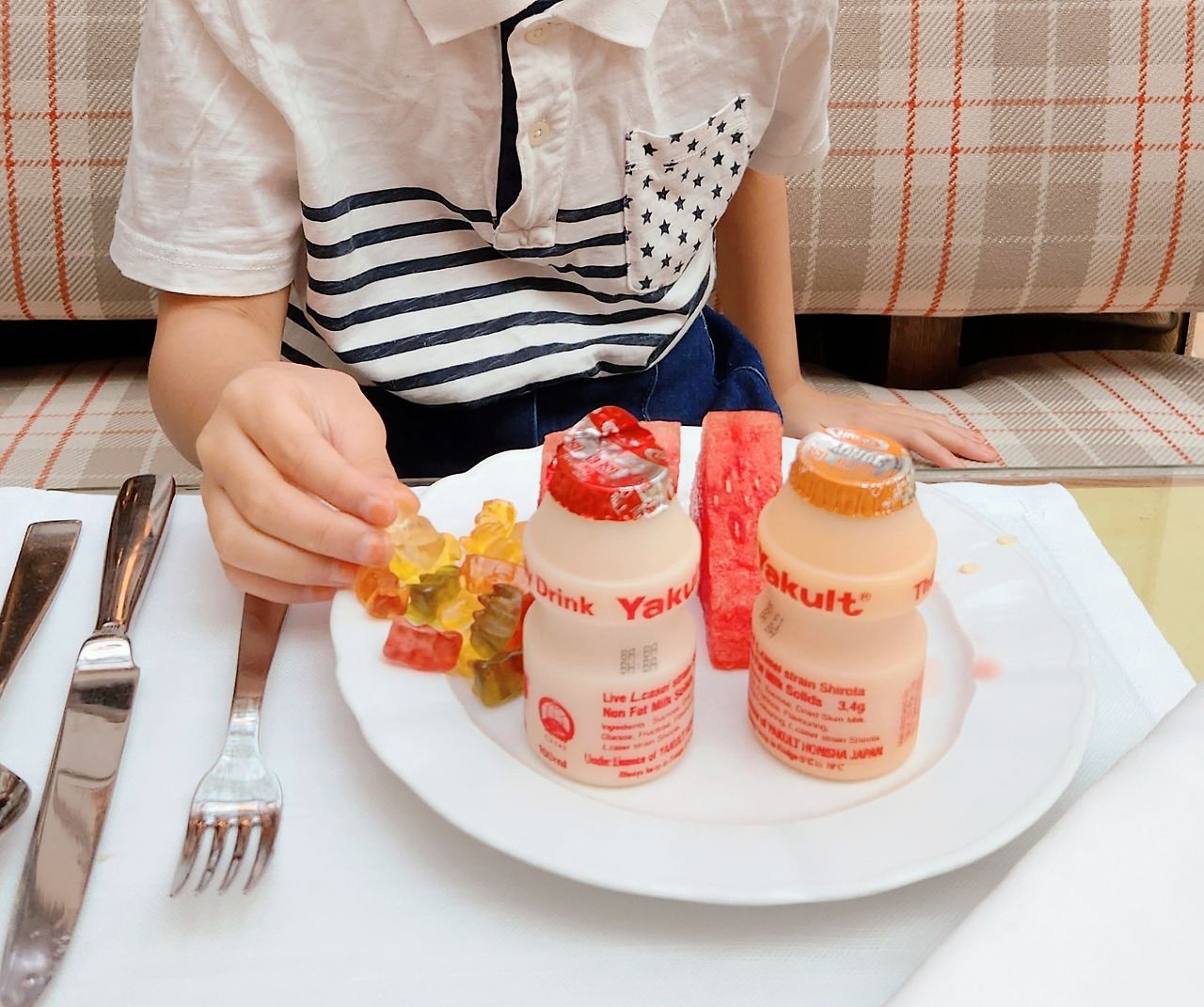 접시 위에는 수박 몇 조각과 요구르트 2개, 젤리가 한 줌 가득 담겨 있었