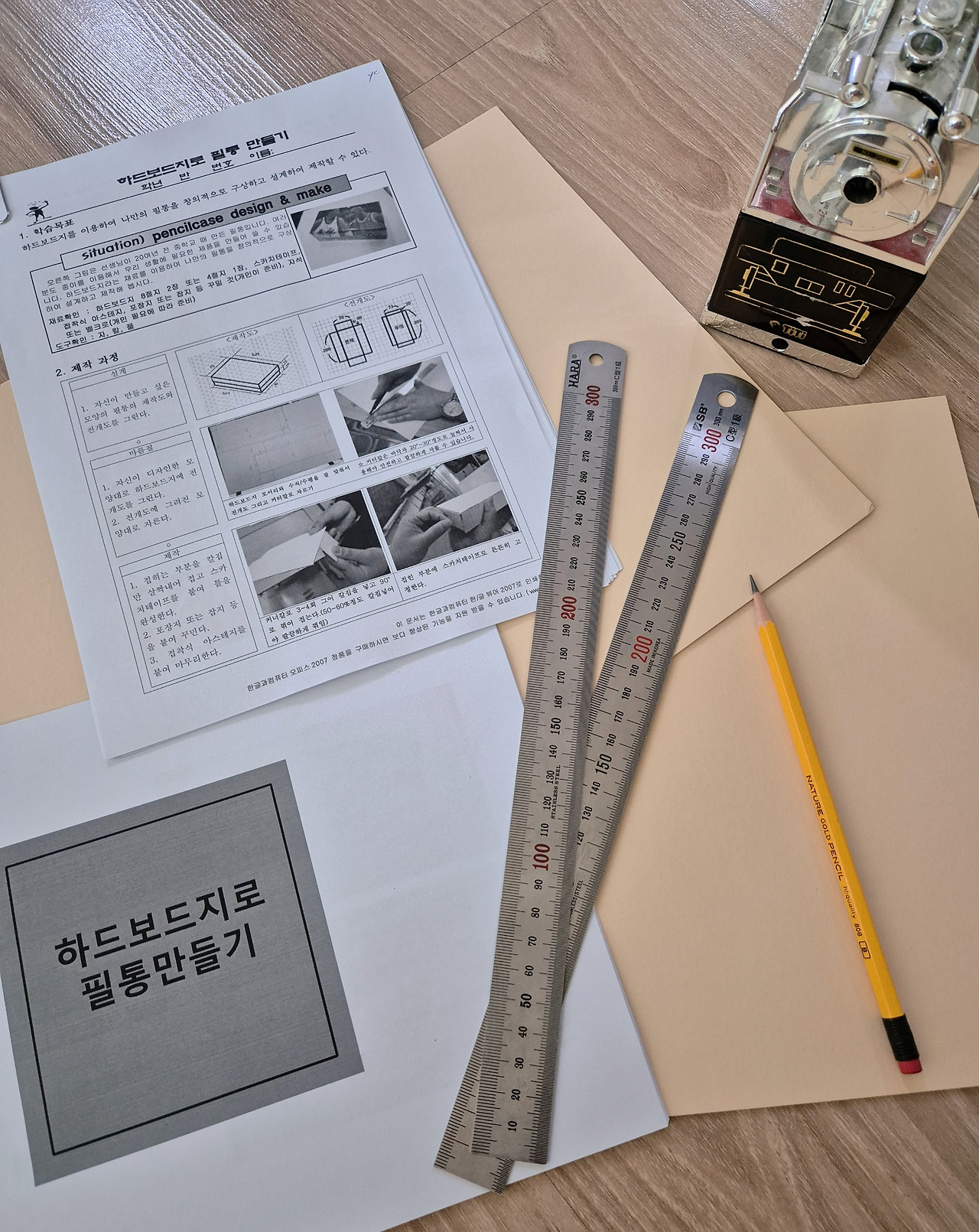하드보드지를 주문할 때만 해도 알 수 있었다. 제일 큰 사이즈에 2mm 두께의 종이를 선호했던 나와 달리 남편은 만들기 쉬운 1mm의 두께와 딱 한 개의 필통이 나올 수 있는 사이즈를 주문했다. 만들고 싶은 사이즈가 다 다를 텐데.. 높이를 높게 만들고 싶은 나는 최대로 끼워 맞춰도 3cm밖에 나오지 않아 불만이었다.