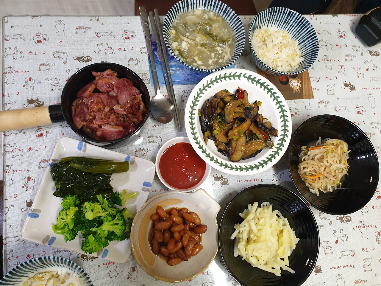 콩가루 냉잇국, 훈제 오리고기, 가지볶음, 땅콩 조림, 숙주나물 무침, 감자볶음, 물미역, 브로콜리 너마저. 반찬이 많지 않더라도 밥 잘 먹는 예쁜 남편이다.