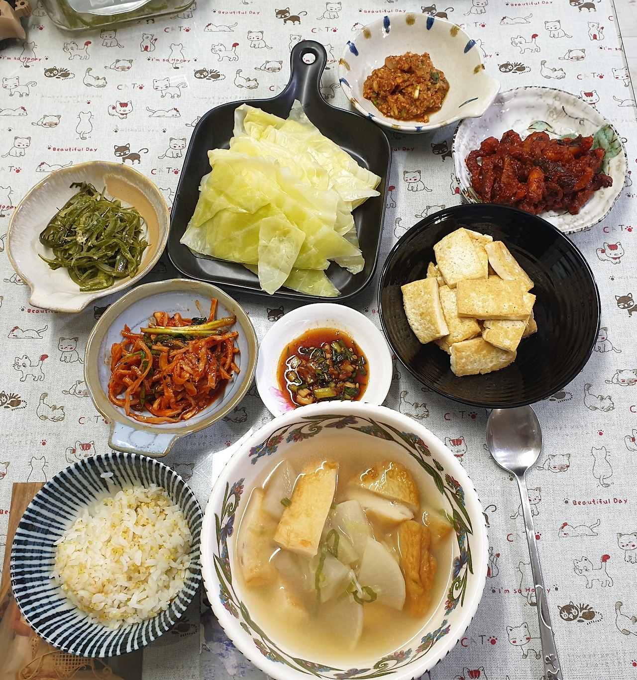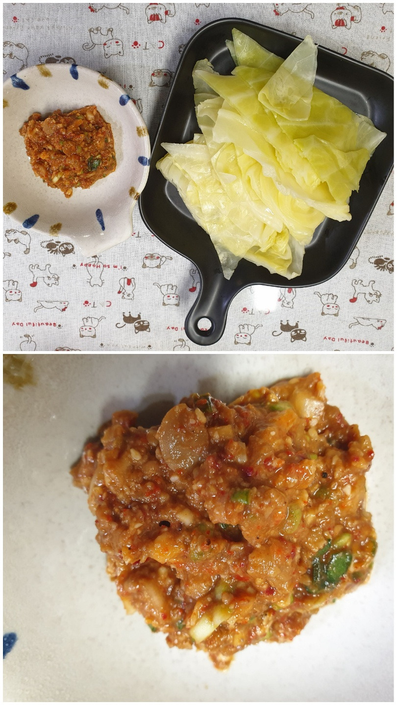 매일 뭐 해 먹냐, 오늘은 뭐 먹니, 이러고 얘길 하다가 지인들끼리 서로의 식탁을 찍어 공유하는 지혜를 짜내기에 이르렀다. 이틀 전의 저녁은 부산 어묵탕, 두부구이, 진미채 무침, 미역줄기 볶음, 주꾸미 볶음, 양배추쌈. 소박하지만 나의 다정한 한 끼. 특히 요즘 양배추쌈에 부쩍 빠져있다. 품을 들여야 하는 일은 식사의 개념과 맞아떨어지는 일이다. 양배추쌈과 곁들일 쌈장을 만들어 보았다.