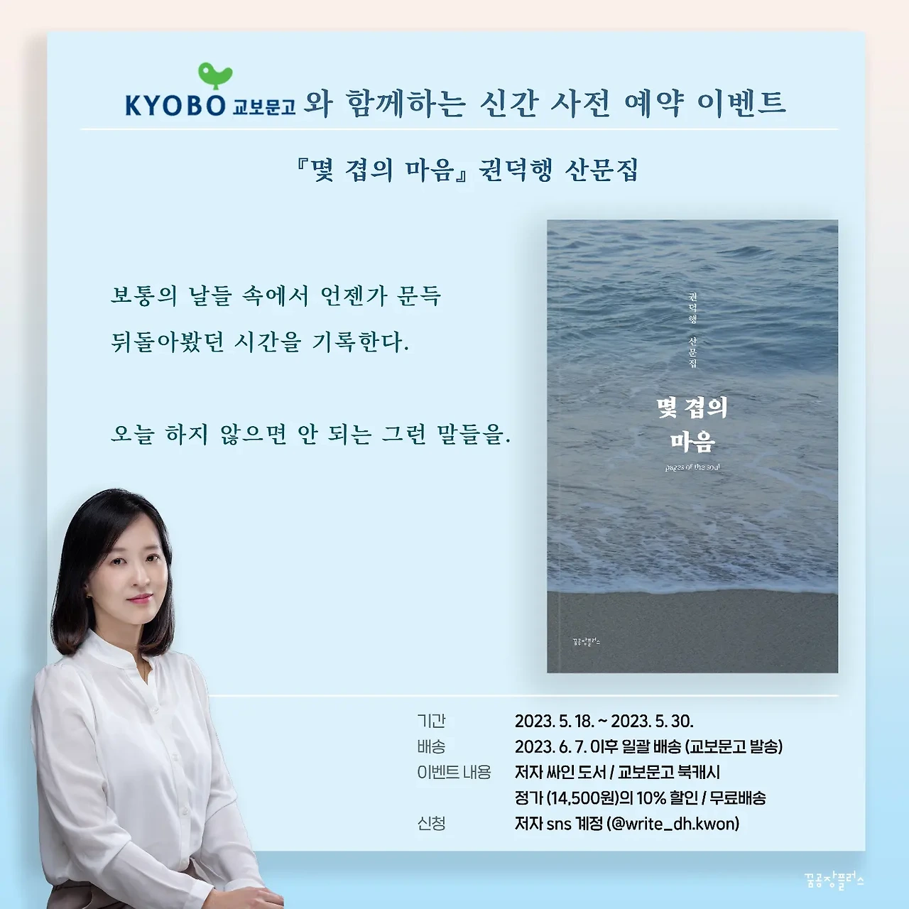 교보문고와 함께하는 『몇 겹의 마음』 사전예약판매 이벤트! ★교보문고와 함께하는 『몇 겹의 마음』 사전예약이벤트!★ [작가 소개] 대학에서 국어국문학을 공부한 이후로 꽤 무용하게 살았다. 누군가가 뛰어갈 때 나는 앉아 있거나 먼 데를 바라보고 있