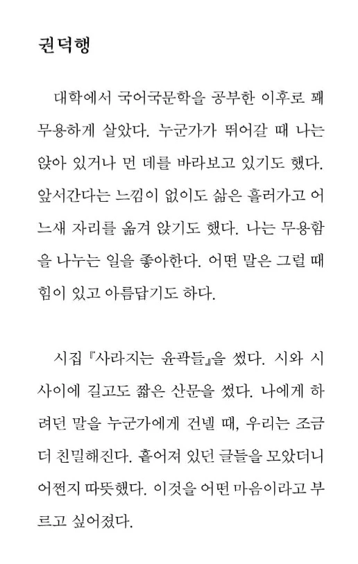 대학에서 국어국문학을 공부한 이후로 꽤 무용하게 살았다. 누군가가 뛰어갈 때 나는 앉아 있거나 먼 데를 바라보고 있기도 했다. 앞서 간다는 느낌이 없이도 삶은 흘러가고 어느새 자리를 옮겨 앉기도 했다. 나는 무용함을 나누는 일을 좋아한다. 어떤 말은 그럴 때 힘이 있고 아름답기도 하다.