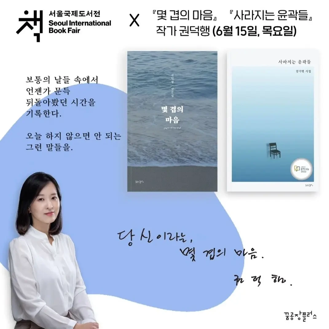 첫 시집 <사라지는 윤곽들>과 6/8일 출간되는 신간 산문집 <몇 겹의 마음>으로 여러분들을 찾아뵙겠습니다. 감사합니다.