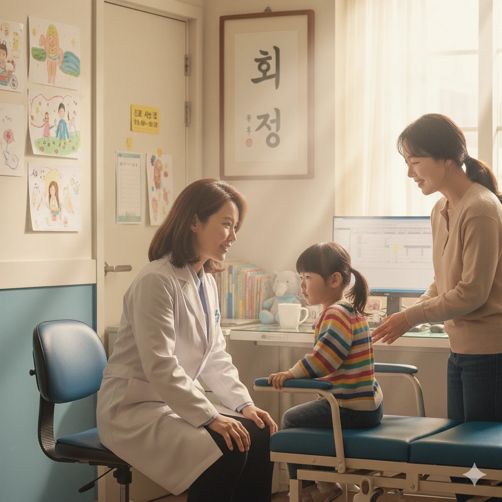 아이를 응원하며 살짝만 도와주셨고, 결국 아이는 혼자 의자에 올라앉았다. 진료도 훨씬 편안하게 이어졌다. 귀 안을 보다가 귀지가 많으면 아이에게 양해를 구하고 직접 제거한 뒤 살펴보셨다. 여러 소아과를 다녔지만 처음 보는 모습이었다. 나중에는 아이들이 먼저 “선생님, 귀 간지러워요. 귀지 빼 주세요”라고 말할 정도였다.
