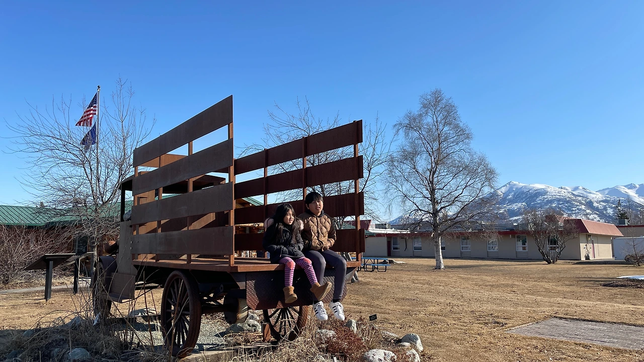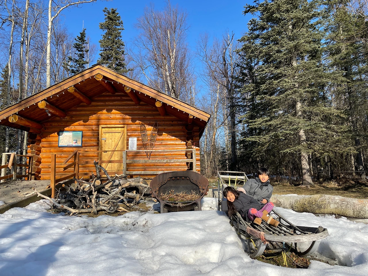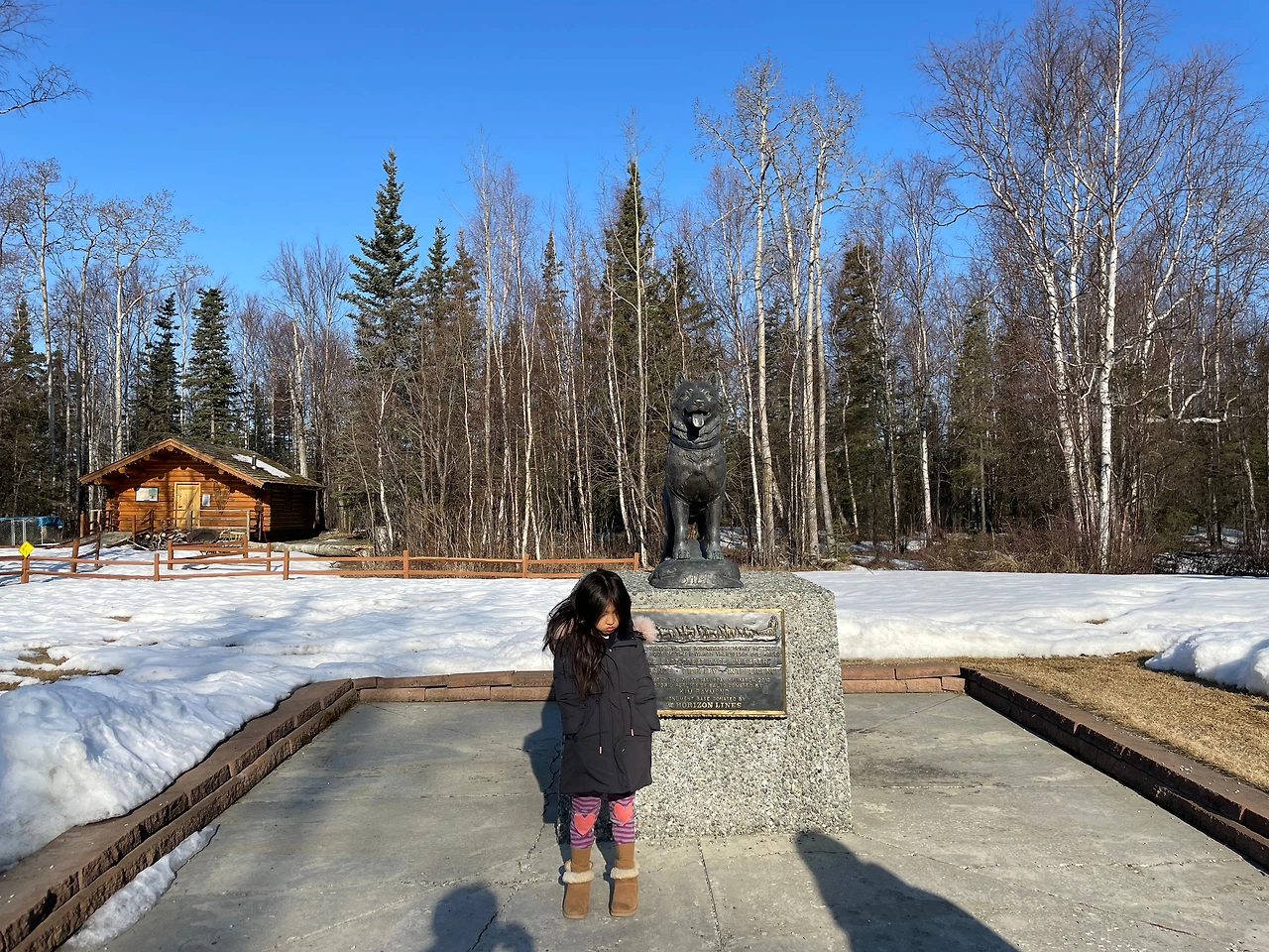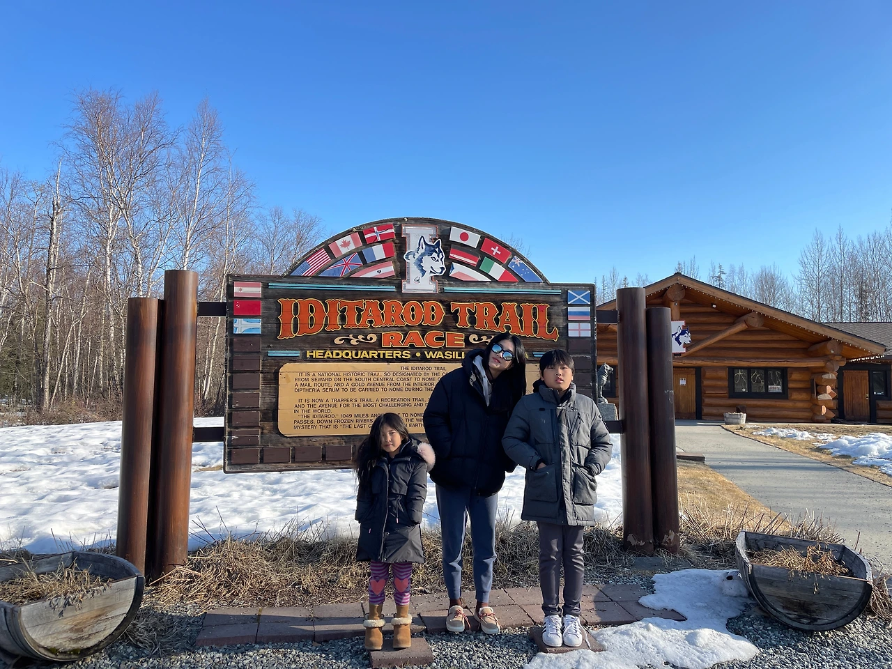 알래스카의 설원을 달리는 알래스카를 대표하는 개인 알래스칸 맬러뮤트(Alaskan Malamute). 그 개가 끄는 개썰매를 타보려고 왔는데 일요일이라서 개장을 안 하더군요. 사실 마음 한편에는 우리 가족의 몸무게로 개들을 힘들게 하고 싶지 않은 마음도 있기는 했지만 막상 굳게 잠긴 문을 보니 잠시 실망했습니다. 간간이 들려오는 멍멍 개 짖는 소리가 자기들도 지금 당장 뛰고 싶다고 말하는 것 같았습니다. 하지만 우리는 그 개들과 대면하지 못했습니다. 우리는 마당에 있는 개 조형물 앞에서 사진 찍고, 빈 터 눈밭에서 강아지처럼 뛰어놀다가 빈 개썰매에 앉아 보고 돌아왔습니다.
