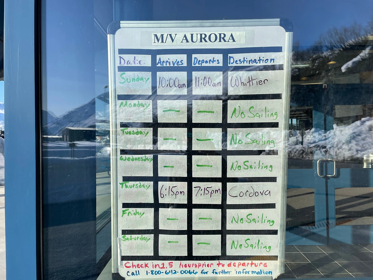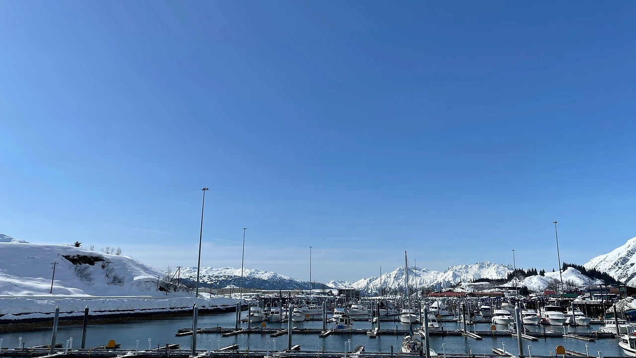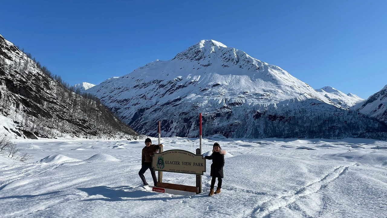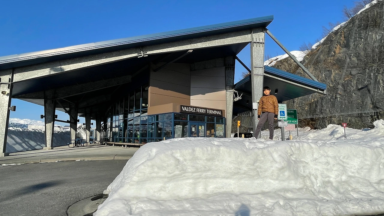 첫 일정으로 우리는 발데즈 페리 터미널에 갔습니다. 운항표를 보니 어떤 이유인지 모르지만 월요일인 오늘은 여객선을 탈 수 없었습니다. 사실 알래스카에는 오로라 때문에 이 기간에 온 것이라서 많이 아쉽지는 않았습니다. 바다 위에서도 먼 설산을 바라보는 코스일 것 같았어요. 대신 근처에 눈 쌓여 만들어진 키 만한 눈 담장을 사이에 둔 눈길을 걷고, 설산 앞에 시원하게 펼쳐진 바다를 실컷 구경했습니다.
