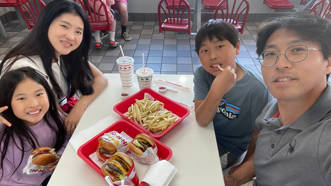 미국 서부 지역에서만 맛볼 수 있는 인 앤 아웃 버거(In-N-Out Burger)에도 들렀습니다. 특히 저는 이곳 감자튀김이 맛있었는데요. 버거도 깔끔한 맛이었어요. 모든 재료를 냉동이 아닌 냉장으로 관리한다고 하더라고요. 그러니 더 신선한 맛이겠죠. 이곳은 옛날 미국을 시간 여행하는 듯한 경험도 제공했습니다. 흰 벽에 작은 빨간색 야자수 모양의 포인트 띠 벽지를 두른 빈티지한 공간이었어요. 또 다른 페스트 푸드점과는 달리 위생에 엄청 신경 쓰는 것 같았어요. 저희가 갔던 대부분의 미국 햄버거집은 바닥에 튀긴 감자조각 몇 개는 굴러다니고 의자나 탁자는 어딘지 모르게 끈적거리는 느낌이었거든요. 청결하게 관리하는 것이 너무 마음에 들었어요. 또 가격도 합리적이더라고요. 우리가 지내고 있는 샬럿은 동부지역이라서 셰이크쉑 버거(Shake shack burger)나 파이브 가이즈 버거즈 앤 프라이즈(Five Guys Burgers and Fries)가 주변에 많아요. 이런 햄버거와 비교해 볼 때 맛, 가격, 청결 상태 등 여러모로 인 앤 아웃 버거가 딱 제 취향이었습니다.