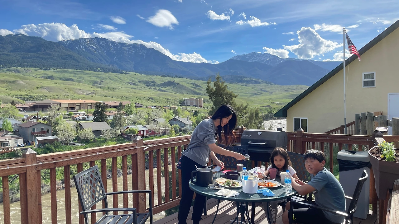 우리가족은 옐로스톤 국립공원 근처인 Gardiner라는곳에 숙박지를 예약했습니다. 국립공원 못지않게 아름다운 풍경과 가까운 곳에 식료품점도 있다는 이유로 이곳을 선택했습니다. 덕분에 눈부시게 푸른 하늘에 대비되는 그림 같은 흰 조각구름을 보며 맛있는 저녁을 먹었습니다. 숙소에 설치된 별도의 테라스에서 하늘도 구경하고 좋아하는 음악도 함께 들으며 여유로운 시간을 보냈습니다.