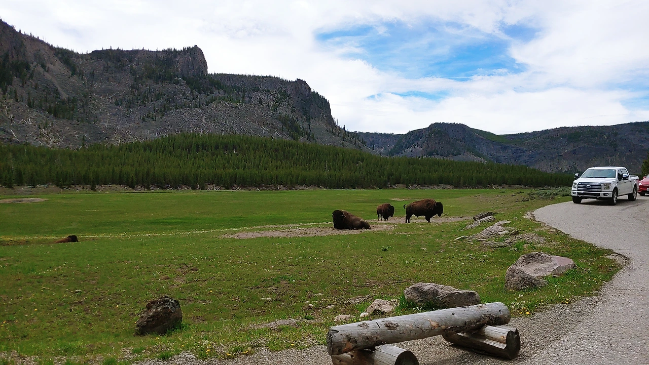 이곳 옐로스톤 국립공원은 1872년 지정된 세계 최초의 국립공원이기도 합니다. 곳곳에서 자연을 사랑하고 지켜내려는 미국인들의 노력을 엿볼 수 있었습니다. 미국의 국립공원에는 곳곳에 관리요원인 파크 레인저들이 상시 대기합니다. 그들은 관광객들의 안전도 지켜주지만 자연 훼손을 감시하는 역할을 하는 듯했습니다. 관광객이 트레일을 벗어나거나 위험한 행동을 할 때 즉시 저지합니다. 우리 가족은 이방인이라 그런지 더 조심해서 다니게 되니 이들의 존재가 든든하더라고요.또 이런 대자연에서 근무하면 스트레스가 있을까라는 생각도 해보았어요. 초록초록한 들판에 평화로운 바이슨 무리들이 한가로이 풀을 뜯으며 노니는 그 장면을 보면 있던 고민도 다 휘발 될 것 같거든요.