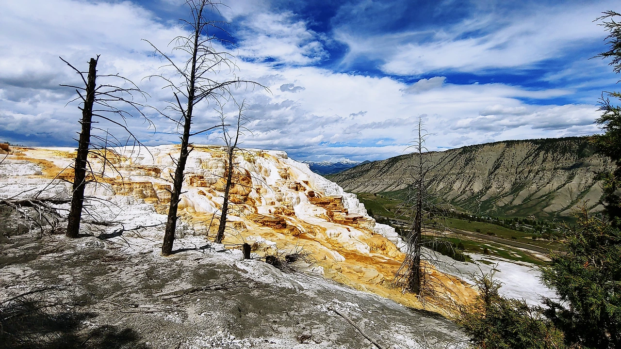 옐로스톤 국립공원의 서쪽 입구에 가까운, 유명한 장소인 Mammoth hot spring에 왔습니다. 이곳은 말 그대로 온천(spring)이라고 불리지만 물은 거의 남아 있지 않습니다. 회색 빛깔 석회석으로 되어 있고 계단과 같은 모양을 하고 있습니다. 듣기로는 이곳은 1990년대만 하더라도 물이 흘렀다고 하는데 지금은 물을 거의 볼 수 없습니다. 물도, 돌도 영원히 똑같은 모습일 수는 없나 봅니다. 나 역시 어제의 나와 오늘의 나는 미세히 다른 나겠죠. 그래서 찰나의 순간인 지금을 충만하게 살아내고싶어요.