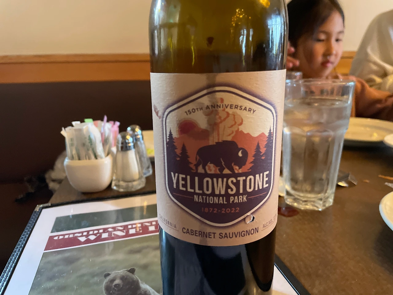 아는 가족들과 공원 안 식당에서 저녁을 먹으며 이런저런 이야기를 나누었습니다. 여행지에서 있었던 소소한 에피소드들과 미국 생활하면서 있었던 일들도 함께하는 식탁 위에서는 맛있는 요리가 되더군요. 먼 여행지에서의 우연한 만남은 서로를 더 소중히 여기게 되는 시간입니다. 또 우리는 옐로스톤 국립공원으로 지정된 지 150주년을 기념하여 만들어진 와인을 마셨는데 참 특별한 추억이 되었습니다.