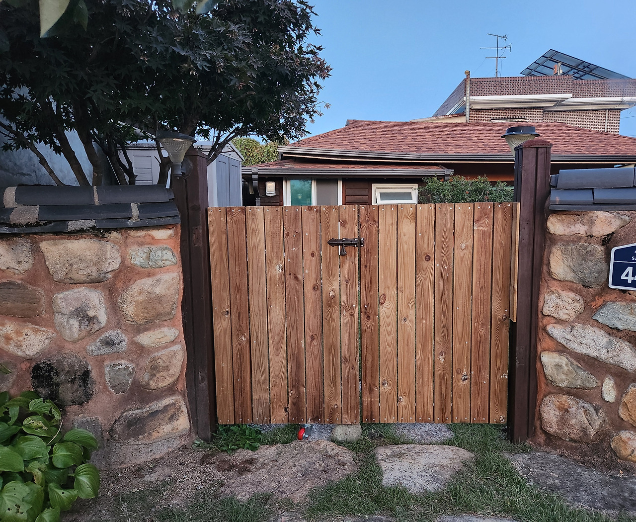 몇 주 뒤, 친구네는 두께가 두꺼운 나무를 써서 아주 튼튼해 보이는 문 두 짝을 싣고 왔다. 원래 있었던 대문도 나무로 되어 있었지만 십 년의 세월에 낡아서 떨어져 나간 부분도 있었다. 솔직히 관리가 소홀해서 더 빨리 나빠진 경향도 있다. 오일스텐을 더 자주 칠해 주었다면 좋았을 텐데. 나의 게으름은 정직하게 내 공간에 고스란히 드러내 준다.