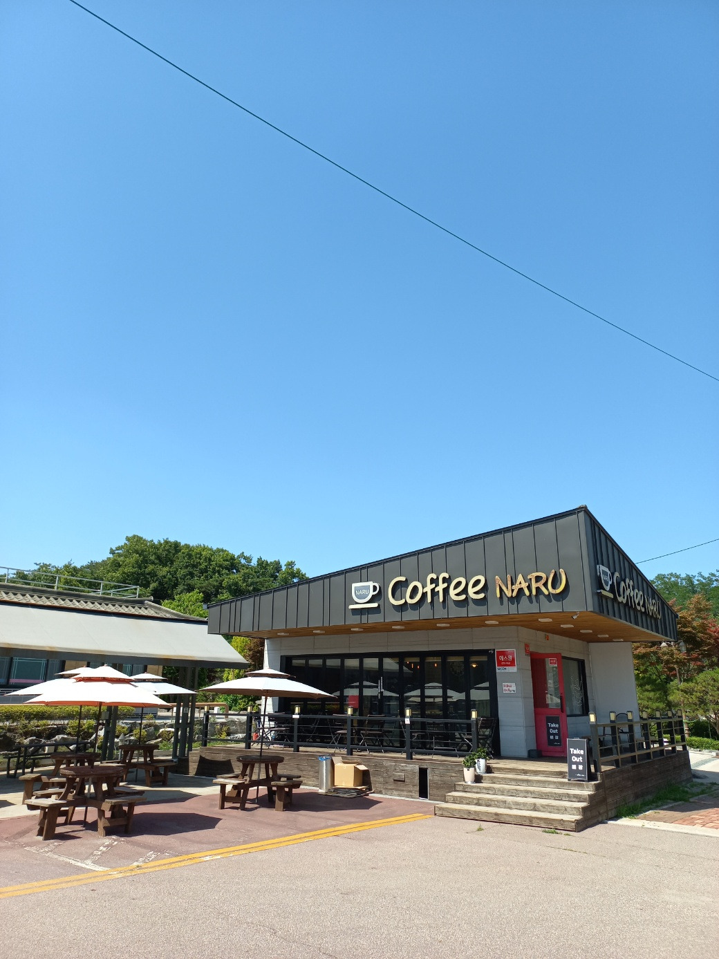 예쁜 연못 옆에 있는 카페에서 시원한 주스와 커피를 마셨다.