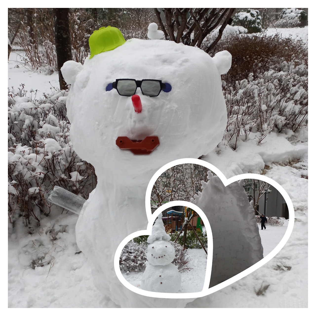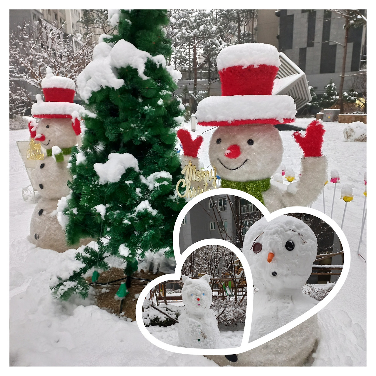 눈사람이 아파트 단지에 한 백개쯤 만들어졌어요. (오리 눈사람까지 하면 아마 넘을걸요. 히힣)