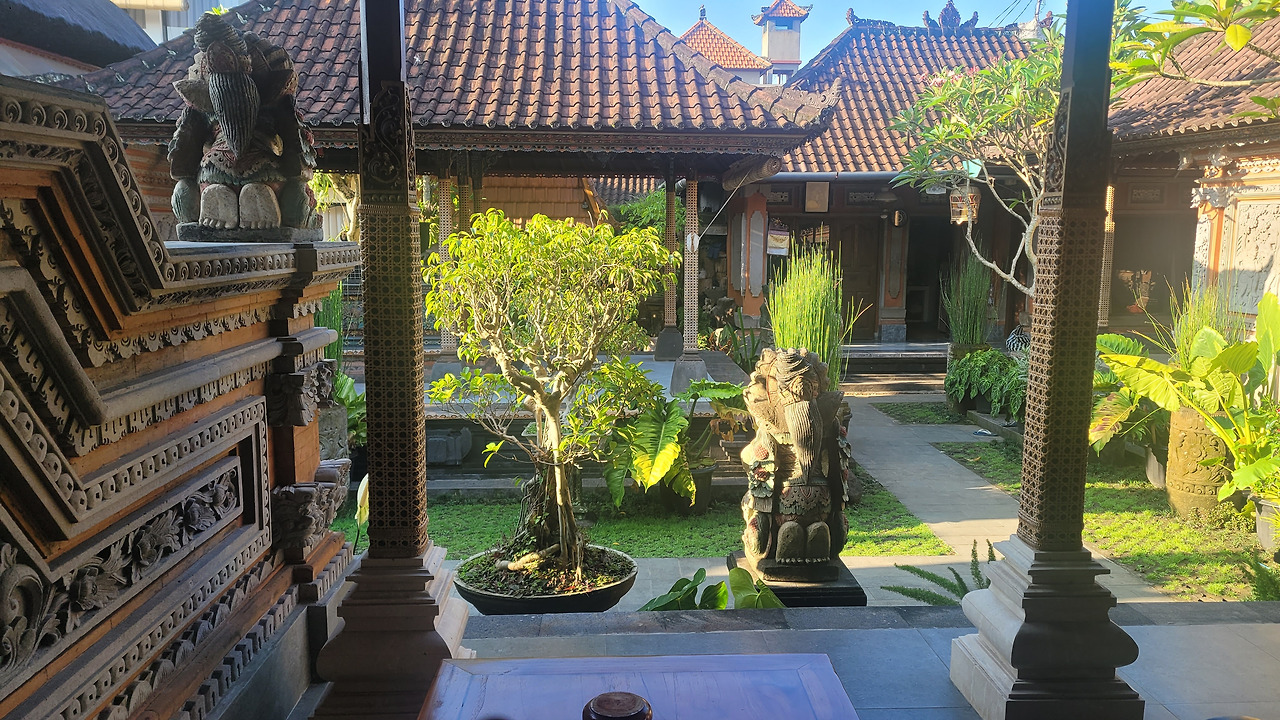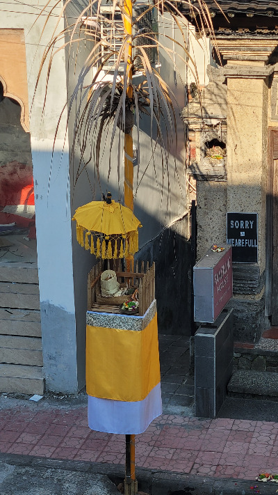 길바닥에 둔 바구니들에도 색색의 꽃과 과자나 담배, 동전이 위에 얹어져 있곤 했는데 각각의 꽃은 동서남북의 신을 상징하고, 그날의 안녕을 바라는 기원이 담겨 있다. 우리가 아침을 먹던 식당은 2층의 야외 테라스여서 맞은편에 이런 제단에 아침마다 공물을 올리는 앞집 아줌마를 볼 수 있었다.