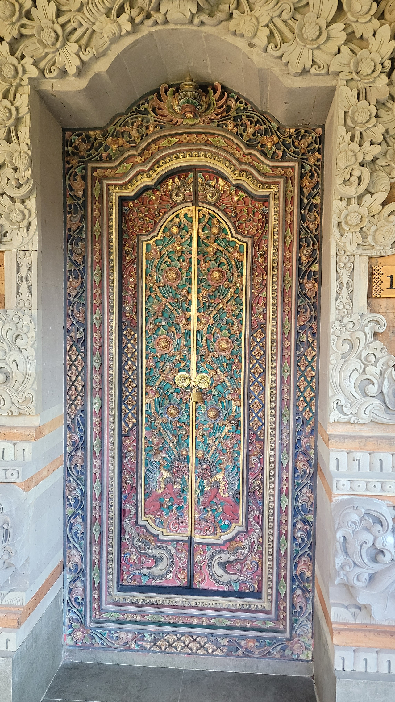 방문의 아래쪽 좌우를 보면 이곳에도 드와라팔라로 보이는 조각이 있다. 사자의 얼굴에 날개가 달려 있는 동물인데, 이는 악한 영혼이나 나쁜 기운을 쫓아내는 수호신 싱아 버르사야쁘인 듯하다.