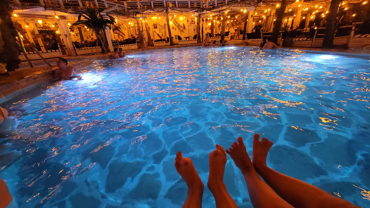 밤이 되니 건물에는 노란 전구 수 천 개가 불을 밝혔다. 수영장은 두 군데에 있었는데, 방갈로가 있는 쪽의 수영장에는 사람이 거의 없었고 우리가 앉아있는 쪽에도 그렇게 많은 사람이 들어가지는 않았다. 대만인인지 중국인들이 수영장 안에 꽤 많았는데, 비키니를 입고 화려하게 화장한 세 명의 중국 아가씨에게는 여러 남자들이 계속해서 말을 걸었다. 래시가드를 입은 사람도 있고, 원피스 수영복을 입은 사람도 있고 다양한 복장으로 자기 좋을 대로 놀면 되는 것 같다. 물이 깨끗하지 않을 거라 생각해서 아예 수영복을 가져가지 않았는데, 생각보다 괜찮다.